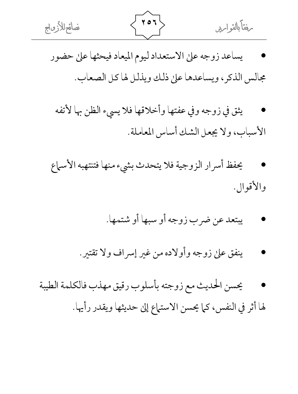 - يساعد زوجه على الاستعداد ليوم الميعاد فيحثها على حضور مجالس الذكر، ويساعدها على ذلك ويذلل لها كل الصعاب.