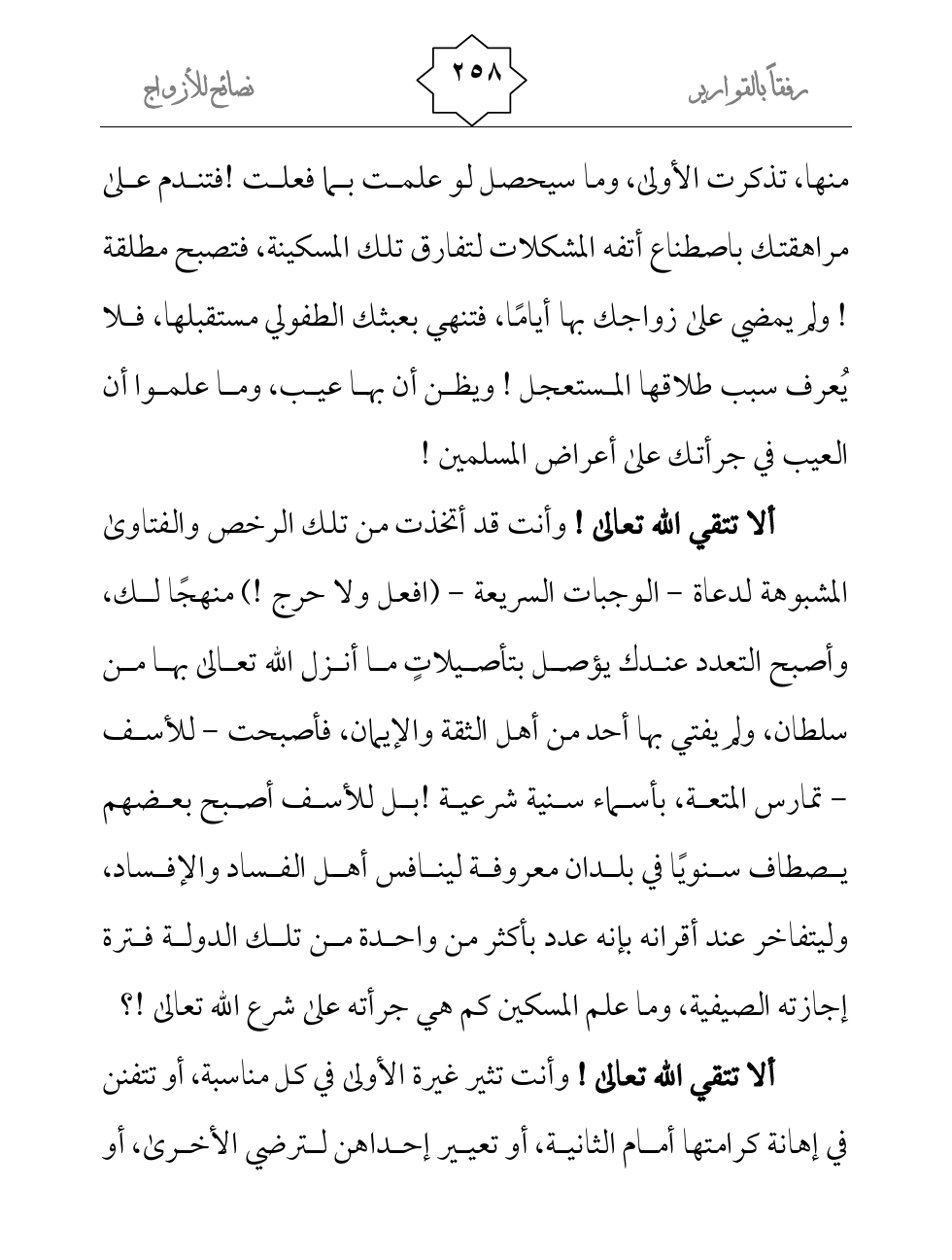 ألا تتقي الله تعالى! وأنت قد أتخذت من تلك الرخص والفتاوى المشبوهة لدعاة - الوجبات السريعة - (افعل ولا حرج!) منهجًا لك، وأصبح التعدد عندك يؤصل بتأصيلاتٍ ما أنزل الله تعالى بها من سلطان، ولم يفتي بها أحد من أهل الثقة والإيمان، فأصبحت - للأسف - تمارس المتعة، بأسماء سنية شرعية! بل للأسف أصبح بعضهم يصطاف سنويًا في بلدان معروفة لينافس أهل الفساد والإفساد، وليتفاخر عند أقرانه بإنه عدد بأكثر من واحدة من تلك الدولة فترة إجازته الصيفية، وما علم المسكين كم هي جرأته على شرع الله تعالى!؟