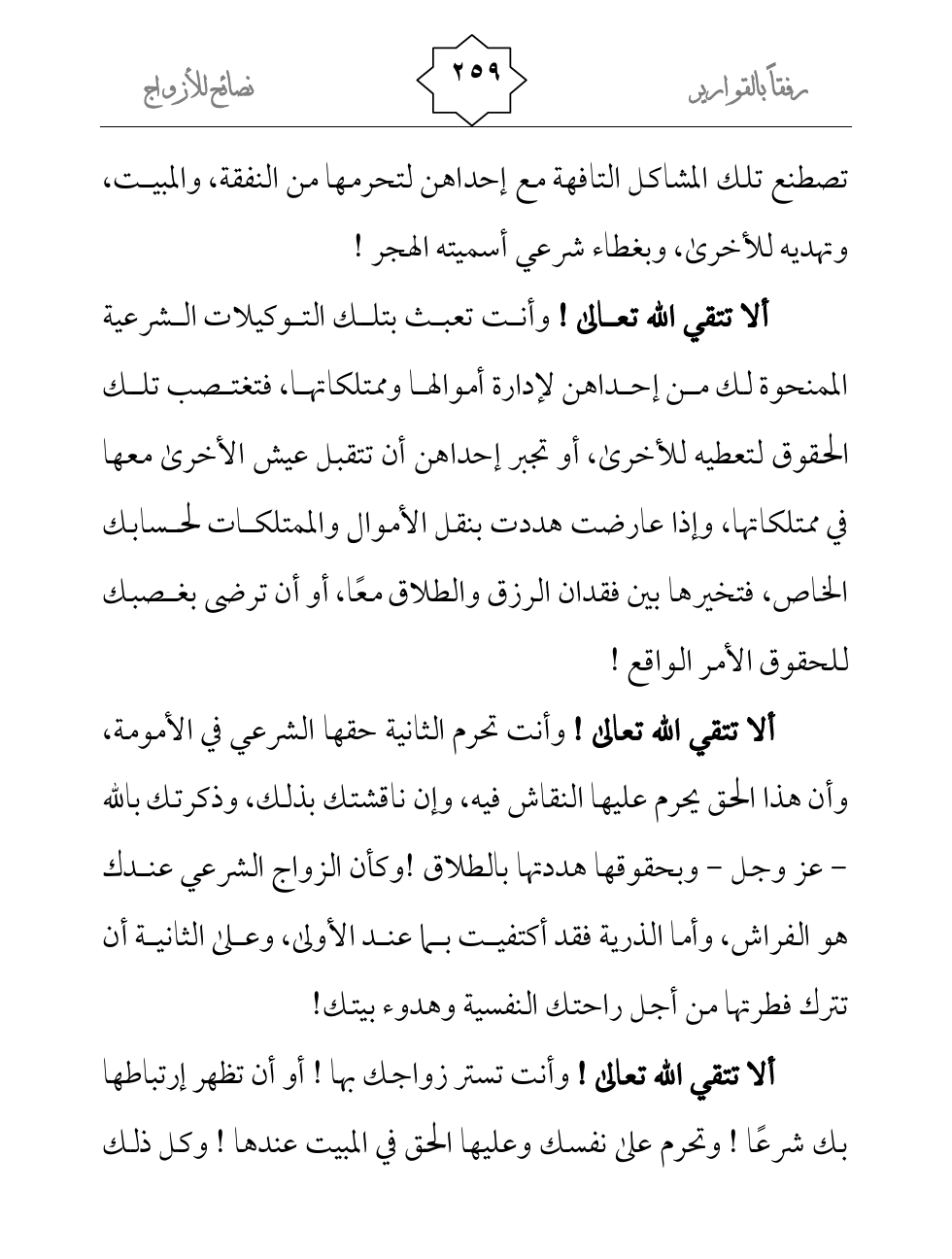 ألا تتقي الله تعالى! وأنت تعبث بتلك التوكيلات الشرعية الممنحوة لك من إحداهن لإدارة أموالها وممتلكاتها، فتغتصب تلك الحقوق لتعطيه للأخرى، أو تجبر إحداهن أن تتقبل عيش الأخرى معها في ممتلكاتها، وإذا عارضت هددت بنقل الأموال والممتلكات لحسابك الخاص، فتخيرها بين فقدان الرزق والطلاق معًا، أو أن ترضى بغصبك للحقوق الأمر الواقع!