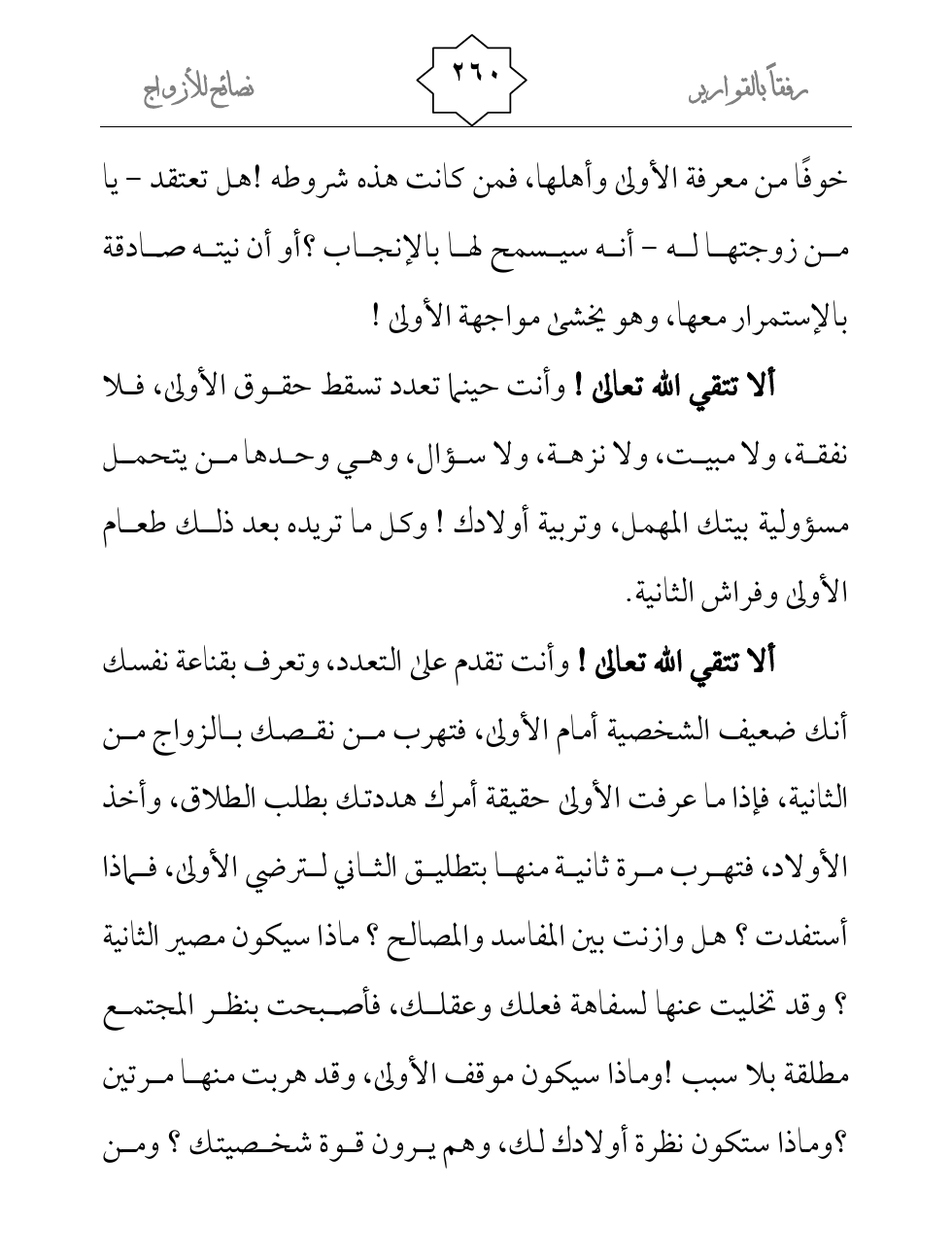 ألا تتقي الله تعالى! وأنت حينما تعدد تسقط حقوق الأولى، فلا نفقة، ولا مبيت، ولا نزهة، ولا سؤال، وهي وحدها من يتحمل مسؤولية بيتك المهمل، وتربية أولادك! وكل ما تريده بعد ذلك طعام الأولى وفراش الثانية.