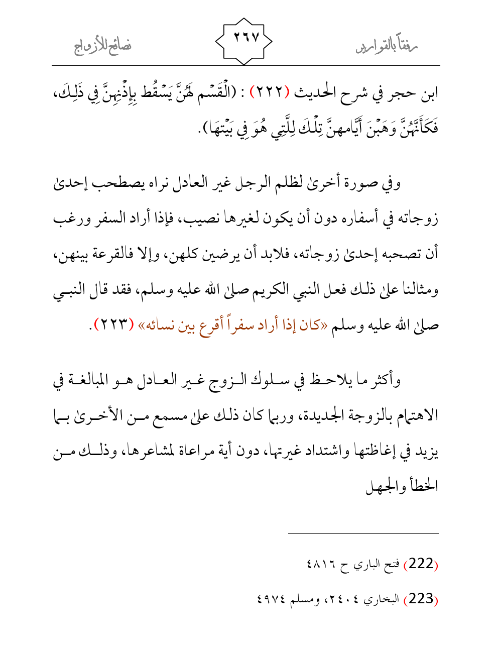 وفي صورة أخرى لظلم الرجل غير العادل نراه يصطحب إحدى زوجاته في أسفاره دون أن يكون لغيرها نصيب، فإذا أراد السفر ورغب أن تصحبه إحدى زوجاته، فلابد أن يرضين كلهن، وإلا فالقرعة بينهن، ومثالنا على ذلك فعل النبي الكريم صلى الله عليه وسلم، فقد قال النبي صلى الله عليه وسلم «كان إذا أراد سفراً أقرع بين نسائه» (¬2) .