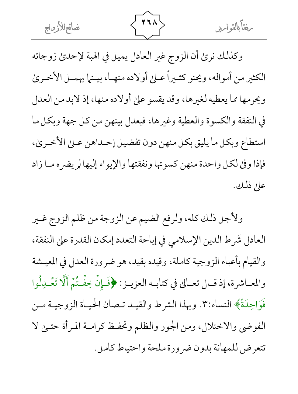 ولأجل ذلك كله، ولرفع الضيم عن الزوجة من ظلم الزوج غير العادل شَرط الدين الإسلامي في إباحة التعدد إمكان القدرة على النفقة، والقيام بأعباء الزوجية كاملة، وقيده بقيد، هو ضرورة العدل في المعيشة والمعاشرة، إذ قال تعالى في كتابه العزيز: {فَإِنْ خِفْتُمْ أَلَّا تَعْدِلُوا فَوَاحِدَةً} النساء:3. وبهذا الشرط والقيد تصان الحياة الزوجية من الفوضى والاختلال، ومن الجور والظلم وتحفظ كرامة المرأة حتى لا تتعرض للمهانة بدون ضرورة ملحة واحتياط كامل.