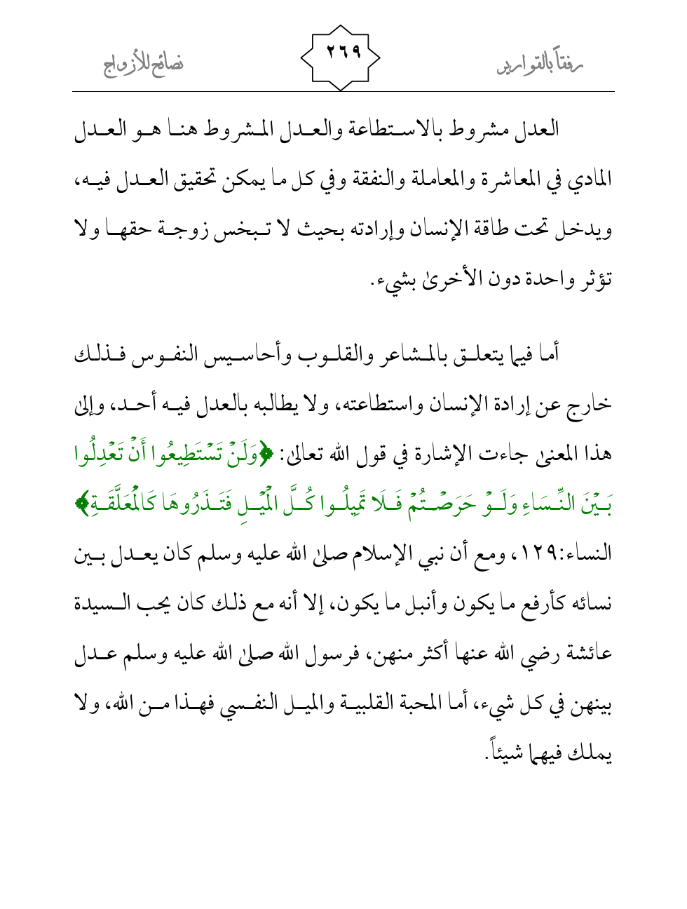أما فيما يتعلق بالمشاعر والقلوب وأحاسيس النفوس فذلك خارج عن إرادة الإنسان واستطاعته، ولا يطالبه بالعدل فيه أحد، وإلى هذا المعنى جاءت الإشارة في قول الله تعالى: {وَلَنْ تَسْتَطِيعُوا أَنْ تَعْدِلُوا بَيْنَ النِّسَاءِ وَلَوْ حَرَصْتُمْ فَلَا تَمِيلُوا كُلَّ الْمَيْلِ فَتَذَرُوهَا كَالْمُعَلَّقَةِ} النساء:129، ومع أن نبي الإسلام صلى الله عليه وسلم كان يعدل بين نسائه كأرفع ما يكون وأنبل ما يكون، إلا أنه مع ذلك كان يحب السيدة عائشة رضي الله عنها أكثر منهن، فرسول الله صلى الله عليه وسلم عدل بينهن في كل شيء، أما المحبة القلبية والميل النفسي فهذا من الله، ولا يملك فيهما شيئاً.