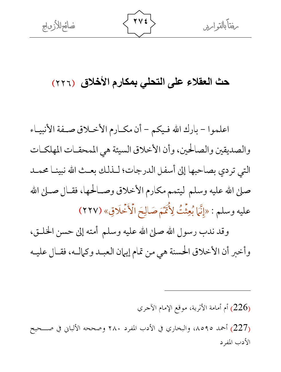 اعلموا - بارك الله فيكم - أن مكارم الأخلاق صفة الأنبياء والصديقين والصالحين، وأن الأخلاق السيئة هي الممحقات المهلكات التي تردي بصاحبها إلى أسفل الدرجات؛ لذلك بعث الله نبينا محمد صلى الله عليه وسلم ليتمم مكارم الأخلاق وصالحها، فقال صلى الله عليه وسلم: «إِنَّمَا بُعِثْتُ لِأُتَمِّمَ صَالِحَ الْأَخْلَاقِ» (¬2)