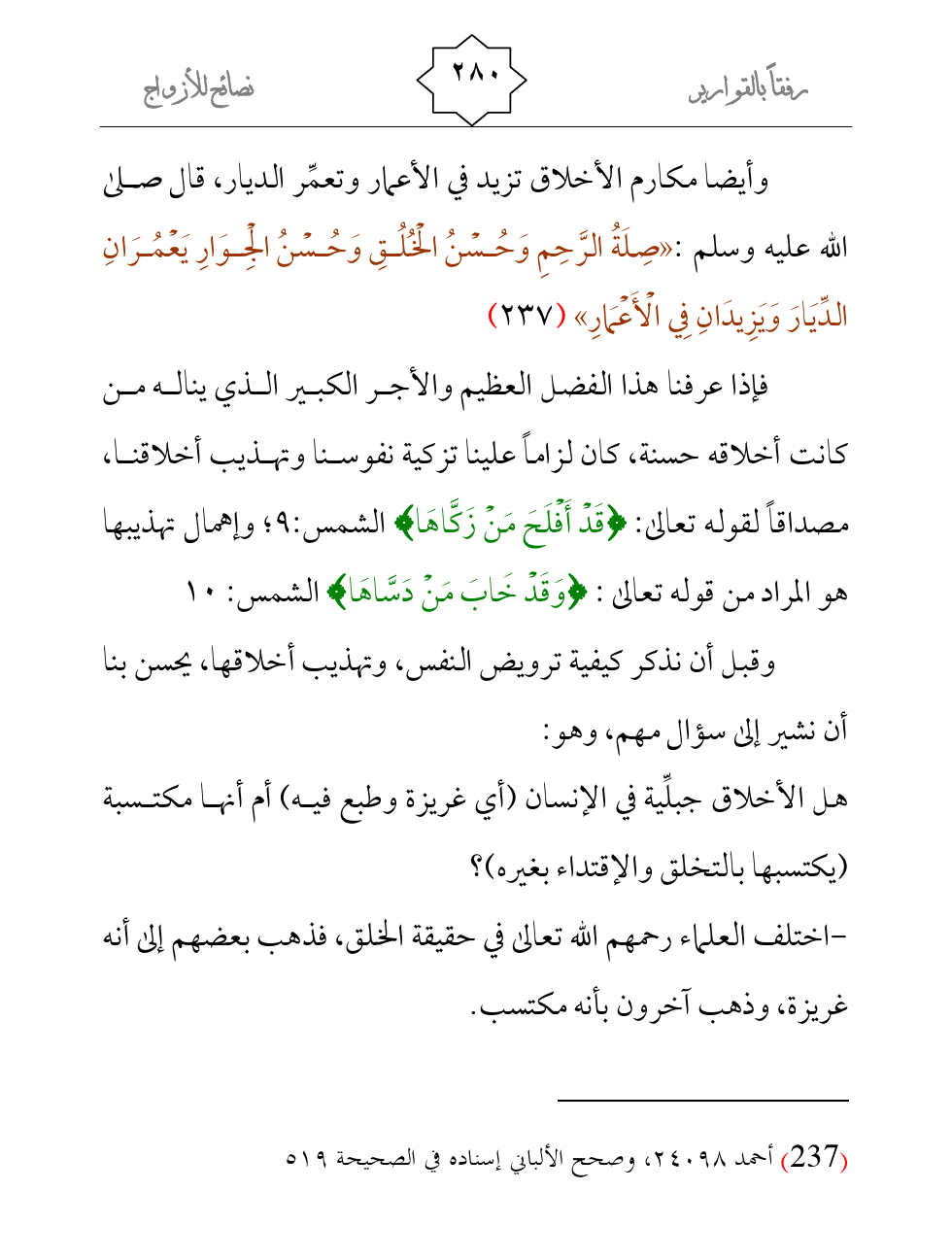 وأيضا مكارم الأخلاق تزيد في الأعمار وتعمِّر الديار، قال صلى الله عليه وسلم: «صِلَةُ الرَّحِمِ وَحُسْنُ الْخُلُقِ وَحُسْنُ الْجِوَارِ يَعْمُرَانِ الدِّيَارَ وَيَزِيدَانِ فِي الْأَعْمَارِ» (¬1)