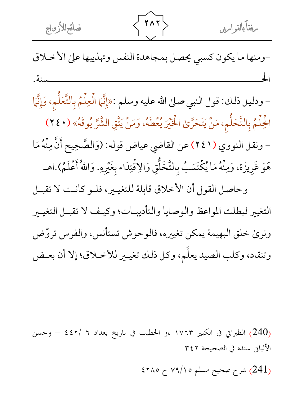- ودليل ذلك: قول النبي صلى الله عليه وسلم: «إِنَّمَا الْعِلْمُ بِالتَّعَلُّمِ، وَإِنَّمَا الْحِلْمُ بِالتَّحَلُّمِ، مَنْ يَتَحَرَّى الْخَيْرَ يُعْطَهُ، وَمَنْ يَتَّقِ الشَّرَّ يُوقَهُ» (¬1)