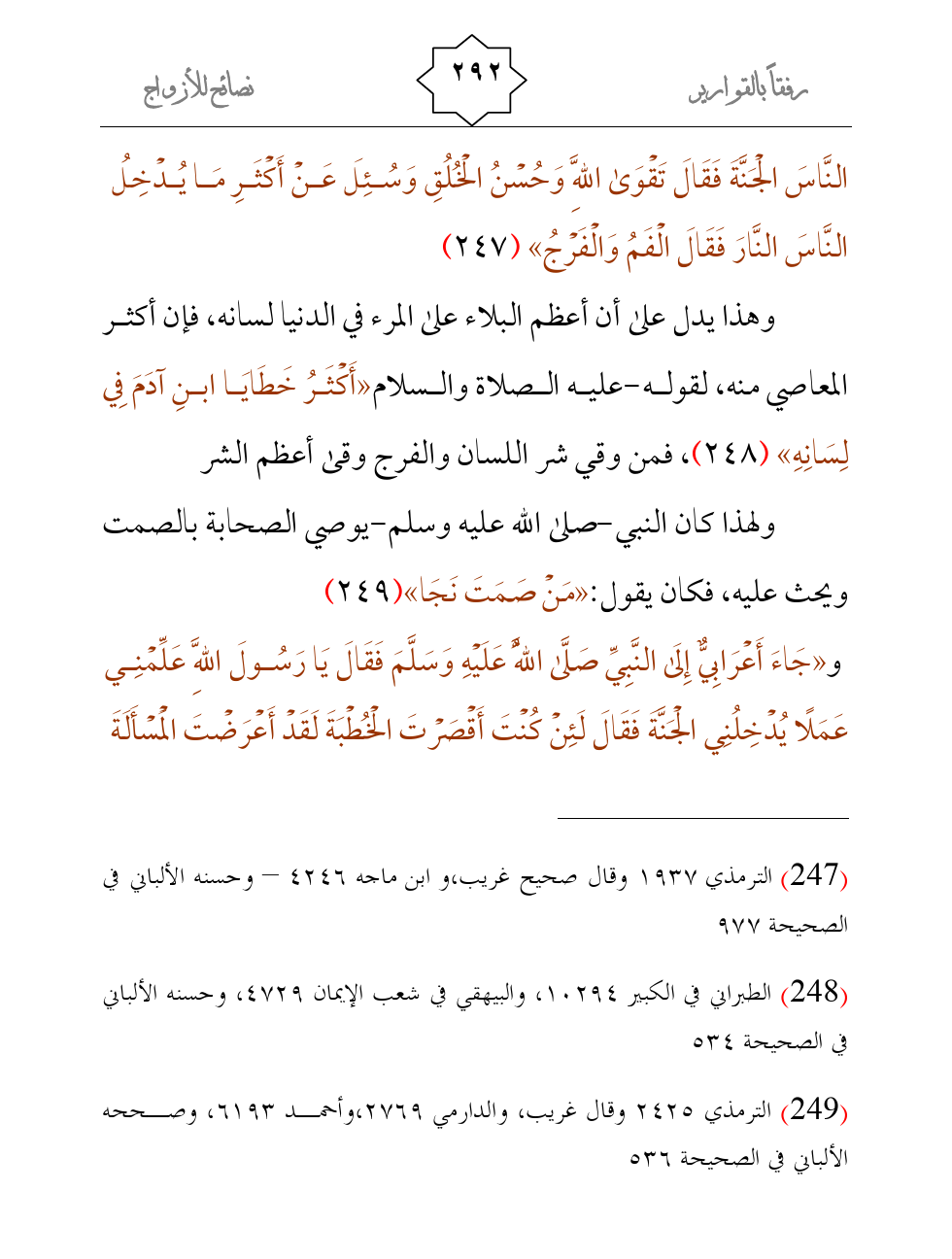 النَّاسَ الْجَنَّةَ فَقَالَ تَقْوَى اللَّهِ وَحُسْنُ الْخُلُقِ وَسُئِلَ عَنْ أَكْثَرِ مَا يُدْخِلُ النَّاسَ النَّارَ فَقَالَ الْفَمُ وَالْفَرْجُ» (¬1)
