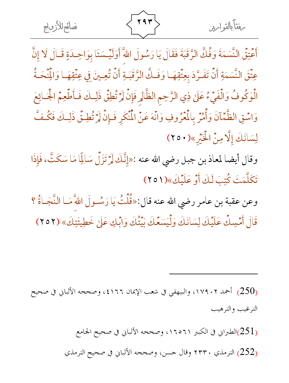 وعن عقبة بن عامر رضي الله عنه قال: «قُلْتُ يَا رَسُولَ اللَّهِ مَا النَّجَاةُ؟ قَالَ أَمْسِكْ عَلَيْكَ لِسَانَكَ وَلْيَسَعْكَ بَيْتُكَ وَابْكِ عَلَى خَطِيئَتِكَ» (¬3)