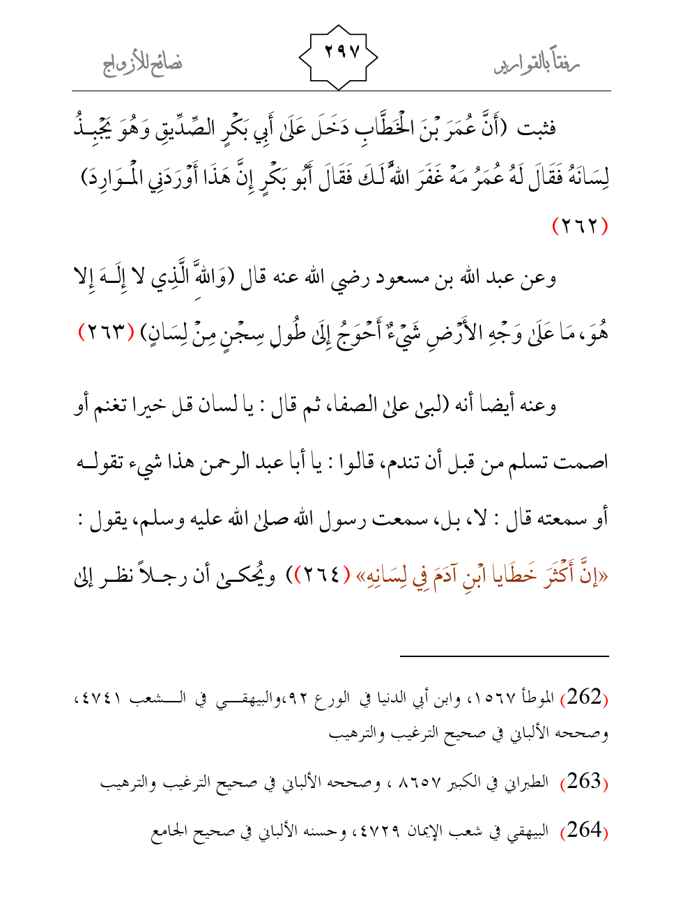وعن عبد الله بن مسعود رضي الله عنه قال (وَاللَّهِ الَّذِي لا إِلَهَ إِلا هُوَ، مَا عَلَى وَجْهِ الأَرْضِ شَيْءٌ أَحْوَجُ إِلَى طُولِ سِجْنٍ مِنْ لِسَانٍ) (¬2)