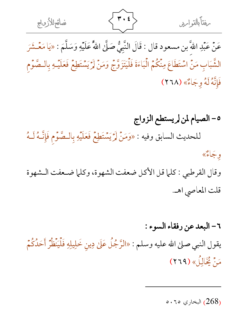 للحديث السابق وفيه: «وَمَنْ لَمْ يَسْتَطِعْ فَعَلَيْهِ بِالصَّوْمِ فَإِنَّهُ لَهُ وِجَاءٌ»