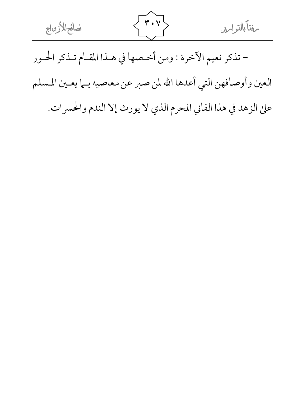 10 - تذكر نعيم الآخرة: ومن أخصها في هذا المقام تذكر الحور العين وأوصافهن التي أعدها الله لمن صبر عن معاصيه بما يعين المسلم على الزهد في هذا الفاني المحرم الذي لا يورث إلا الندم والحسرات.
