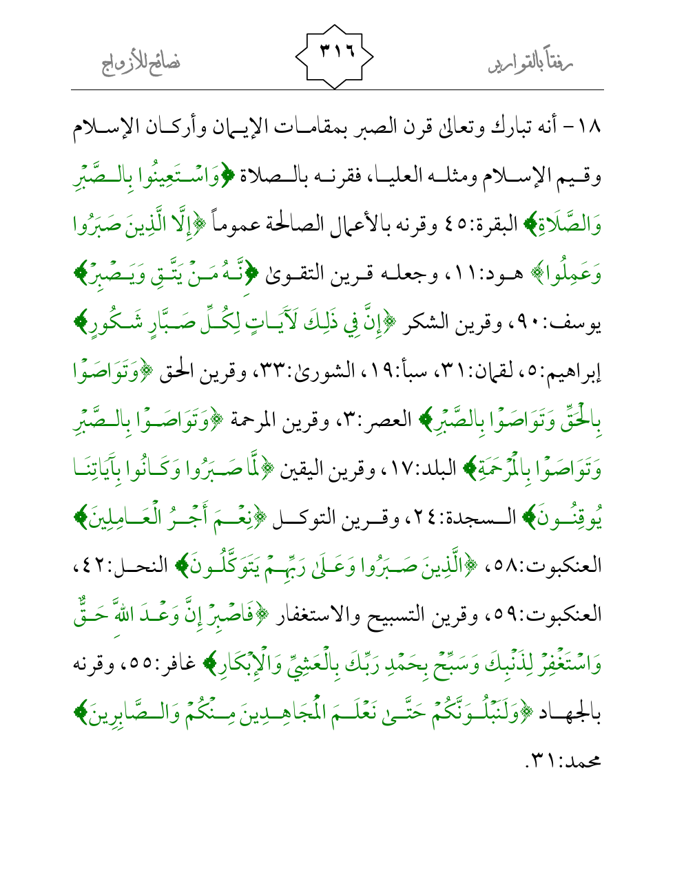 18- أنه تبارك وتعالى قرن الصبر بمقامات الإيمان وأركان الإسلام وقيم الإسلام ومثله العليا، فقرنه بالصلاة {وَاسْتَعِينُوا بِالصَّبْرِ وَالصَّلَاةِ} البقرة:45 وقرنه بالأعمال الصالحة عموماً {إِلَّا الَّذِينَ صَبَرُوا وَعَمِلُوا} هود:11، وجعله قرين التقوى {نَّهُ مَنْ يَتَّقِ وَيَصْبِرْ} يوسف:90، وقرين الشكر {إِنَّ فِي ذَلِكَ لَآَيَاتٍ لِكُلِّ صَبَّارٍ شَكُورٍ} إبراهيم:5، لقمان:31، سبأ:19، الشورى:33، وقرين الحق {وَتَوَاصَوْا بِالْحَقِّ وَتَوَاصَوْا بِالصَّبْرِ} العصر:3، وقرين المرحمة {وَتَوَاصَوْا بِالصَّبْرِ وَتَوَاصَوْا بِالْمَرْحَمَةِ} البلد:17، وقرين اليقين {لَمَّا صَبَرُوا وَكَانُوا بِآَيَاتِنَا يُوقِنُونَ} السجدة:24، وقرين التوكل {نِعْمَ أَجْرُ الْعَامِلِينَ} العنكبوت:58، {الَّذِينَ صَبَرُوا وَعَلَى رَبِّهِمْ يَتَوَكَّلُونَ} النحل:42، العنكبوت:59، وقرين التسبيح والاستغفار {فَاصْبِرْ إِنَّ وَعْدَ اللَّهِ حَقٌّ وَاسْتَغْفِرْ لِذَنْبِكَ وَسَبِّحْ بِحَمْدِ رَبِّكَ بِالْعَشِيِّ وَالْإِبْكَارِ} غافر:55، وقرنه بالجهاد {وَلَنَبْلُوَنَّكُمْ حَتَّى نَعْلَمَ الْمُجَاهِدِينَ مِنْكُمْ وَالصَّابِرِينَ} محمد:31.