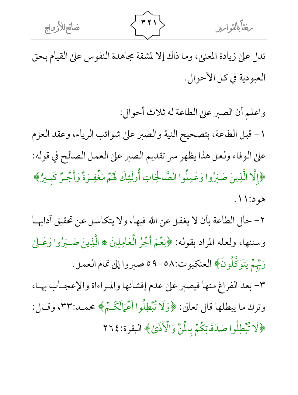 1- قبل الطاعة، بتصحيح النية والصبر على شوائب الرياء، وعقد العزم على الوفاء ولعل هذا يظهر سر تقديم الصبر على العمل الصالح في قوله: {إِلَّا الَّذِينَ صَبَرُوا وَعَمِلُوا الصَّالِحَاتِ أُولَئِكَ لَهُمْ مَغْفِرَةٌ وَأَجْرٌ كَبِيرٌ} هود:11.