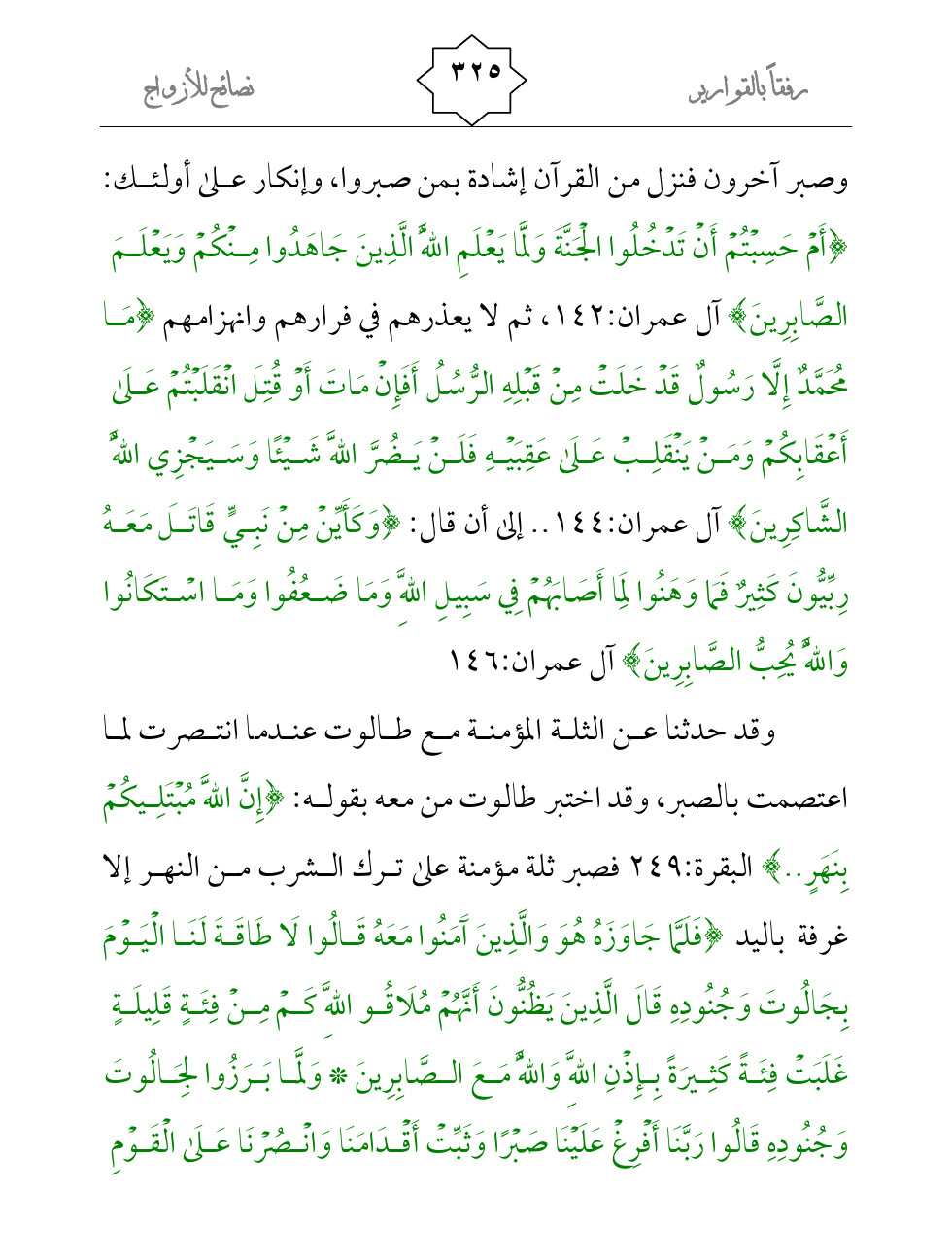 وصبر آخرون فنزل من القرآن إشادة بمن صبروا، وإنكار على أولئك: {أَمْ حَسِبْتُمْ أَنْ تَدْخُلُوا الْجَنَّةَ وَلَمَّا يَعْلَمِ اللَّهُ الَّذِينَ جَاهَدُوا مِنْكُمْ وَيَعْلَمَ الصَّابِرِينَ} آل عمران:142، ثم لا يعذرهم في فرارهم وانهزامهم {مَا مُحَمَّدٌ إِلَّا رَسُولٌ قَدْ خَلَتْ مِنْ قَبْلِهِ الرُّسُلُ أَفَإِنْ مَاتَ أَوْ قُتِلَ انْقَلَبْتُمْ عَلَى أَعْقَابِكُمْ وَمَنْ يَنْقَلِبْ عَلَى عَقِبَيْهِ فَلَنْ يَضُرَّ اللَّهَ شَيْئًا وَسَيَجْزِي اللَّهُ الشَّاكِرِينَ} آل عمران:144.. إلى أن قال: {وَكَأَيِّنْ مِنْ نَبِيٍّ قَاتَلَ مَعَهُ رِبِّيُّونَ كَثِيرٌ فَمَا وَهَنُوا لِمَا أَصَابَهُمْ فِي سَبِيلِ اللَّهِ وَمَا ضَعُفُوا وَمَا اسْتَكَانُوا وَاللَّهُ يُحِبُّ الصَّابِرِينَ} آل عمران:146