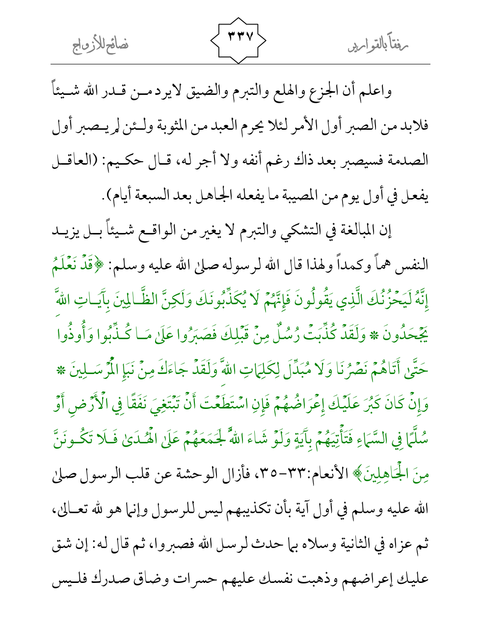 إن المبالغة في التشكي والتبرم لا يغير من الواقع شيئاً بل يزيد النفس هماً وكمداً ولهذا قال الله لرسوله صلى الله عليه وسلم: {قَدْ نَعْلَمُ إِنَّهُ لَيَحْزُنُكَ الَّذِي يَقُولُونَ فَإِنَّهُمْ لَا يُكَذِّبُونَكَ وَلَكِنَّ الظَّالِمِينَ بِآَيَاتِ اللَّهِ يَجْحَدُونَ * وَلَقَدْ كُذِّبَتْ رُسُلٌ مِنْ قَبْلِكَ فَصَبَرُوا عَلَى مَا كُذِّبُوا وَأُوذُوا حَتَّى أَتَاهُمْ نَصْرُنَا وَلَا مُبَدِّلَ لِكَلِمَاتِ اللَّهِ وَلَقَدْ جَاءَكَ مِنْ نَبَإِ الْمُرْسَلِينَ * وَإِنْ كَانَ كَبُرَ عَلَيْكَ إِعْرَاضُهُمْ فَإِنِ اسْتَطَعْتَ أَنْ تَبْتَغِيَ نَفَقًا فِي الْأَرْضِ أَوْ سُلَّمًا فِي السَّمَاءِ فَتَأْتِيَهُمْ بِآَيَةٍ وَلَوْ شَاءَ اللَّهُ لَجَمَعَهُمْ عَلَى الْهُدَى فَلَا تَكُونَنَّ مِنَ الْجَاهِلِينَ} الأنعام:33-35، فأزال الوحشة عن قلب الرسول صلى الله عليه وسلم في أول آية بأن تكذيبهم ليس للرسول وإنما هو لله تعالى، ثم عزاه في الثانية وسلاه بما حدث لرسل الله فصبروا، ثم قال له: إن شق عليك إعراضهم وذهبت نفسك عليهم حسرات وضاق صدرك فليس