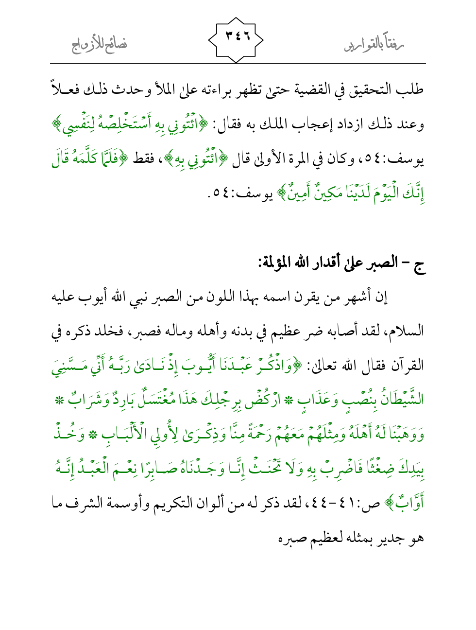 إن أشهر من يقرن اسمه بهذا اللون من الصبر نبي الله أيوب عليه السلام، لقد أصابه ضر عظيم في بدنه وأهله وماله فصبر، فخلد ذكره في القرآن فقال الله تعالى: {وَاذْكُرْ عَبْدَنَا أَيُّوبَ إِذْ نَادَى رَبَّهُ أَنِّي مَسَّنِيَ الشَّيْطَانُ بِنُصْبٍ وَعَذَابٍ * ارْكُضْ بِرِجْلِكَ هَذَا مُغْتَسَلٌ بَارِدٌ وَشَرَابٌ * وَوَهَبْنَا لَهُ أَهْلَهُ وَمِثْلَهُمْ مَعَهُمْ رَحْمَةً مِنَّا وَذِكْرَى لِأُولِي الْأَلْبَابِ * وَخُذْ بِيَدِكَ ضِغْثًا فَاضْرِبْ بِهِ وَلَا تَحْنَثْ إِنَّا وَجَدْنَاهُ صَابِرًا نِعْمَ الْعَبْدُ إِنَّهُ أَوَّابٌ} ص:41-44، لقد ذكر له من ألوان التكريم وأوسمة الشرف ما هو جدير بمثله لعظيم صبره