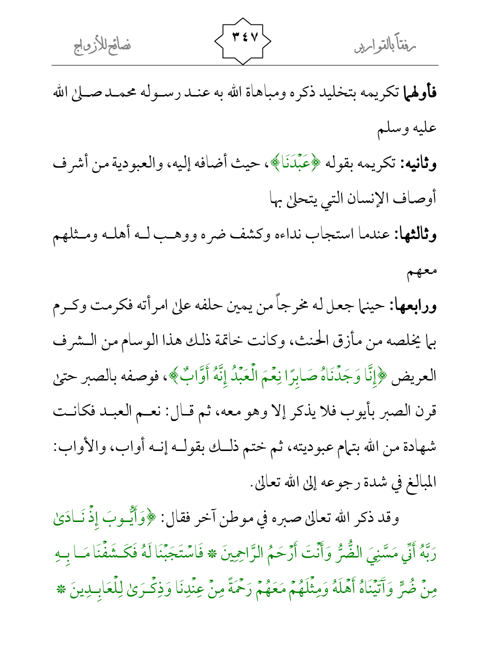ورابعها: حينما جعل له مخرجاً من يمين حلفه على امرأته فكرمت وكرم بما يخلصه من مأزق الحنث، وكانت خاتمة ذلك هذا الوسام من الشرف العريض {إِنَّا وَجَدْنَاهُ صَابِرًا نِعْمَ الْعَبْدُ إِنَّهُ أَوَّابٌ} ، فوصفه بالصبر حتى قرن الصبر بأيوب فلا يذكر إلا وهو معه، ثم قال: نعم العبد فكانت شهادة من الله بتمام عبوديته، ثم ختم ذلك بقوله إنه أواب، والأواب: المبالغ في شدة رجوعه إلى الله تعالى.