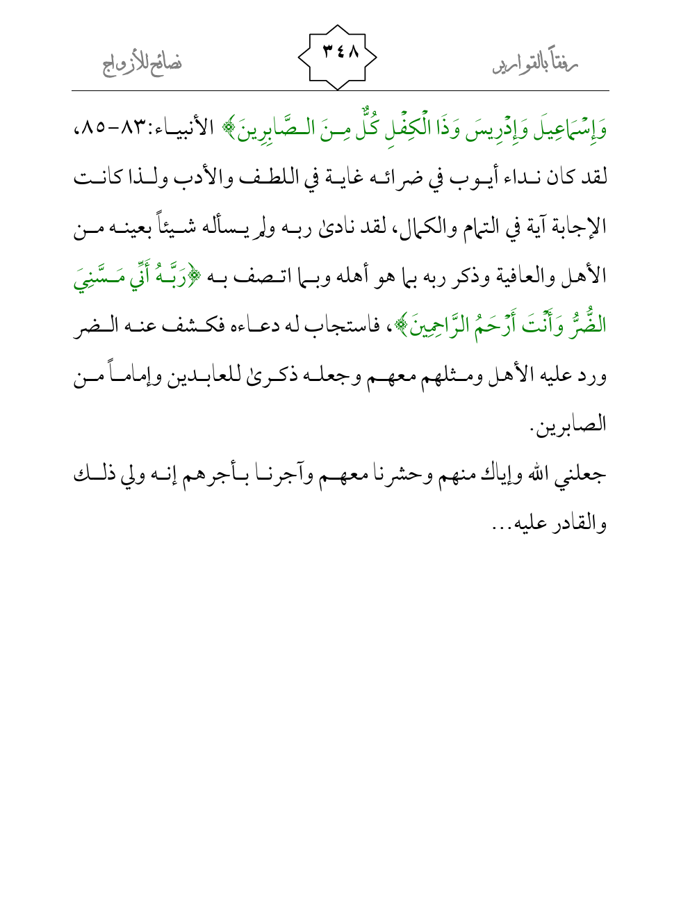وَإِسْمَاعِيلَ وَإِدْرِيسَ وَذَا الْكِفْلِ كُلٌّ مِنَ الصَّابِرِينَ} الأنبياء:83-85، لقد كان نداء أيوب في ضرائه غاية في اللطف والأدب ولذا كانت الإجابة آية في التمام والكمال، لقد نادى ربه ولم يسأله شيئاً بعينه من الأهل والعافية وذكر ربه بما هو أهله وبما اتصف به {رَبَّهُ أَنِّي مَسَّنِيَ الضُّرُّ وَأَنْتَ أَرْحَمُ الرَّاحِمِينَ} ، فاستجاب له دعاءه فكشف عنه الضر ورد عليه الأهل ومثلهم معهم وجعله ذكرى للعابدين وإماماً من الصابرين.