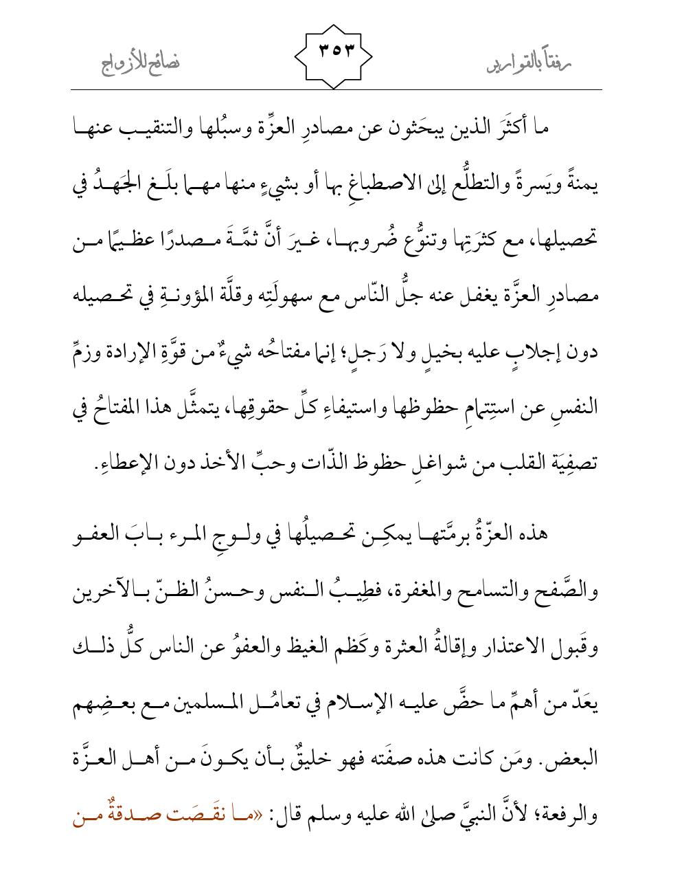 ما أكثَرَ الذين يبحَثون عن مصادرِ العزِّة وسبُلها والتنقيب عنها يمنةً ويَسرةً والتطلُّع إلى الاصطباغِ بها أو بشيءٍ منها مهما بلَغ الجَهدُ في تحصيلها، مع كثرَتِها وتنوُّع ضُروبها، غيرَ أنَّ ثمَّةَ مصدرًا عظيمًا من مصادرِ العزَّة يغفل عنه جلُّ النّاس مع سهولَتِه وقلَّة المؤونةِ في تحصيله دون إجلابٍ عليه بخيلٍ ولا رَجلٍ؛ إنما مفتاحُه شيءٌ من قوَّةِ الإرادة وزمِّ النفسِ عن استِتمامِ حظوظها واستيفاءِ كلِّ حقوقِها، يتمثَّل هذا المفتاحُ في تصفِيَة القلب من شواغلِ حظوظ الذّات وحبِّ الأخذ دون الإعطاءِ.