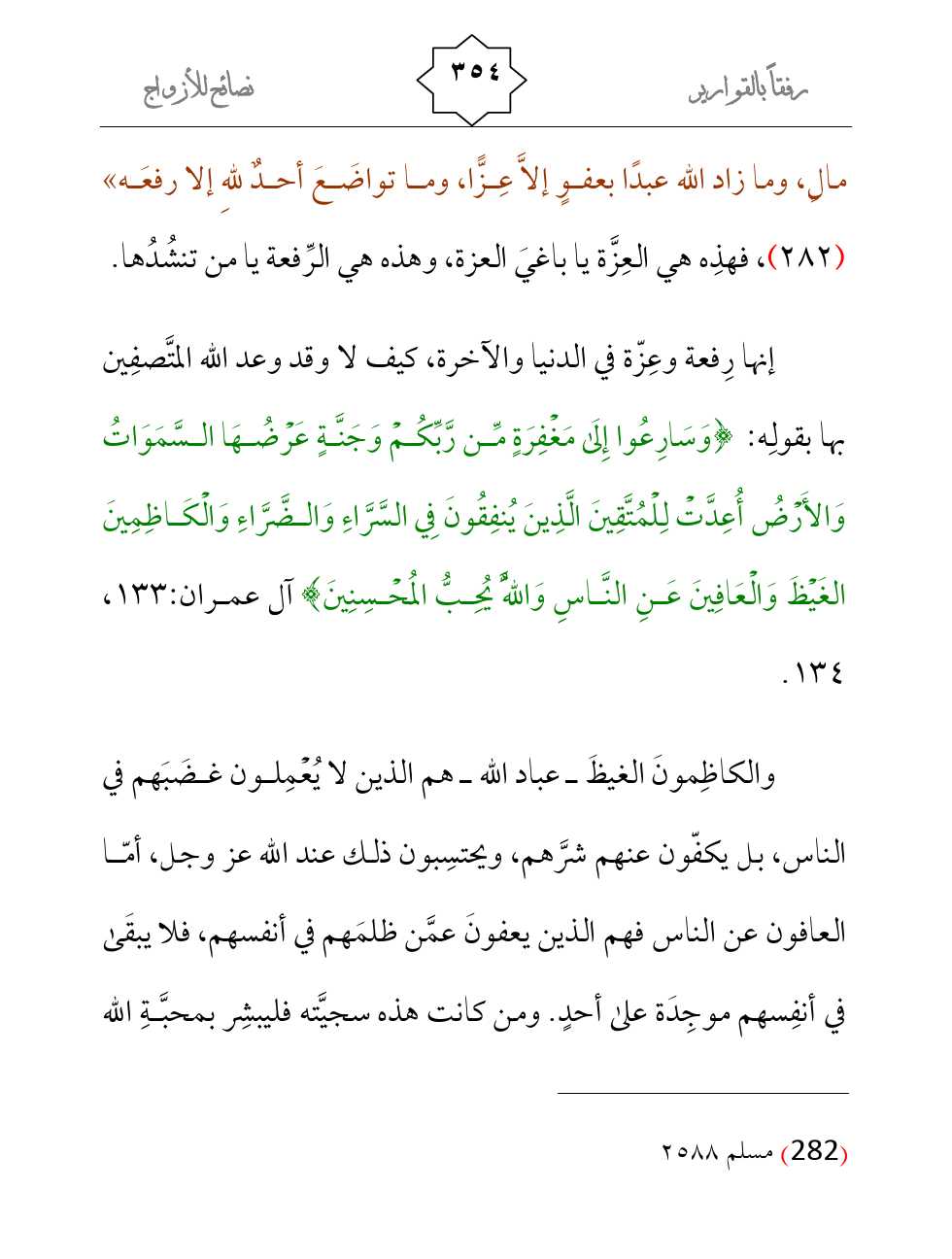 مالٍ، وما زاد الله عبدًا بعفوٍ إلاَّ عِزًّا، وما تواضَعَ أحدٌ للهِ إلا رفعَه» (¬1) ، فهذِه هي العِزَّة يا باغيَ العزة، وهذه هي الرِّفعة يا من تنشُدُها.