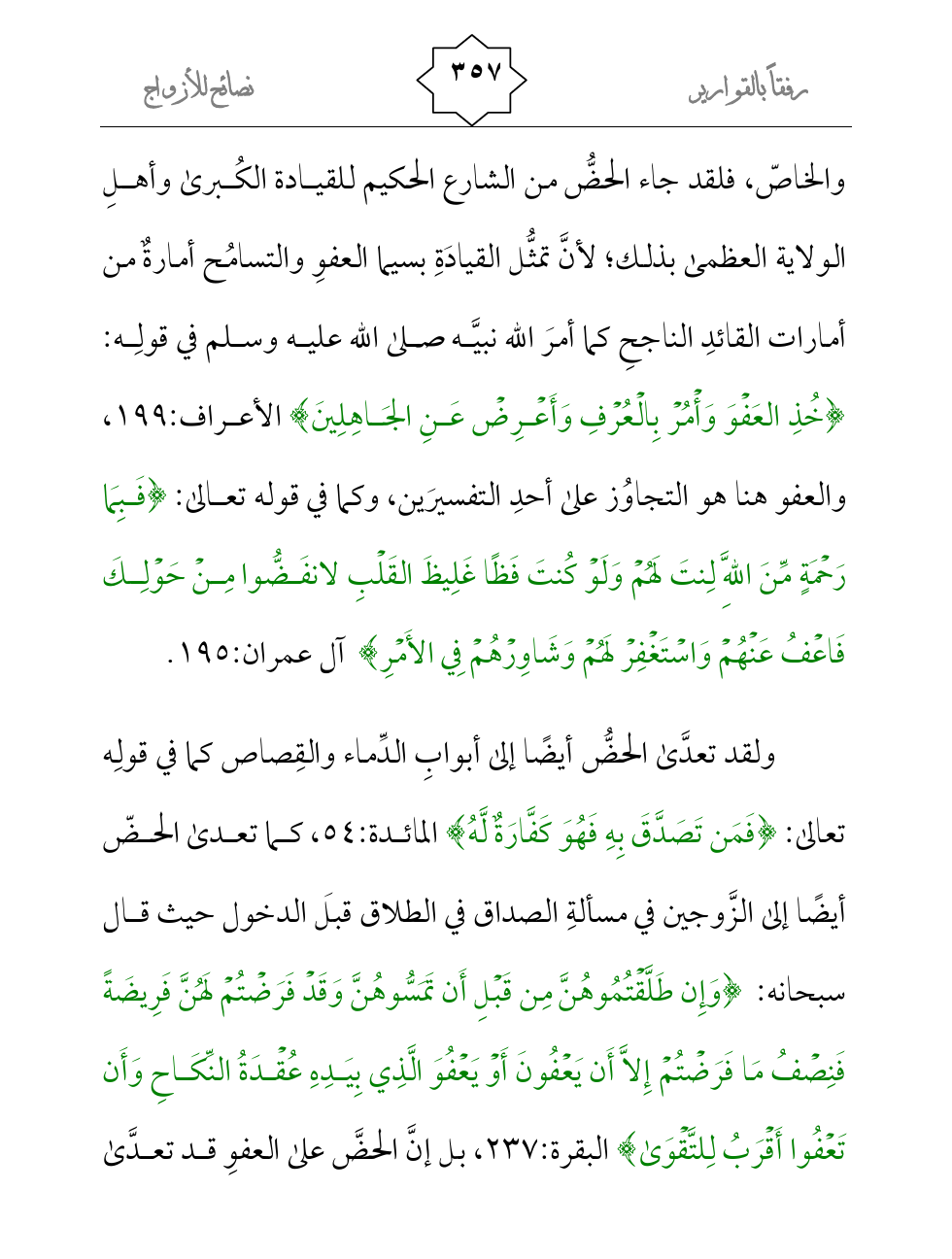 والخاصّ، فلقد جاء الحضُّ من الشارع الحكيم للقيادة الكُبرى وأهلِ الولاية العظمى بذلك؛ لأنَّ تمثُّل القيادَةِ بسيما العفوِ والتسامُح أمارةٌ من أمارات القائدِ الناجحِ كما أمرَ الله نبيَّه صلى الله عليه وسلم في قولِه: {خُذِ العَفْوَ وَأْمُرْ بِالْعُرْفِ وَأَعْرِضْ عَنِ الجَاهِلِينَ} الأعراف:199، والعفو هنا هو التجاوُز على أحدِ التفسيرَين، وكما في قوله تعالى: {فَبِمَا رَحْمَةٍ مِّنَ اللَّهِ لِنتَ لَهُمْ وَلَوْ كُنتَ فَظًا غَلِيظَ القَلْبِ لانفَضُّوا مِنْ حَوْلِكَ فَاعْفُ عَنْهُمْ وَاسْتَغْفِرْ لَهُمْ وَشَاوِرْهُمْ فِي الأَمْرِ} آل عمران:195.