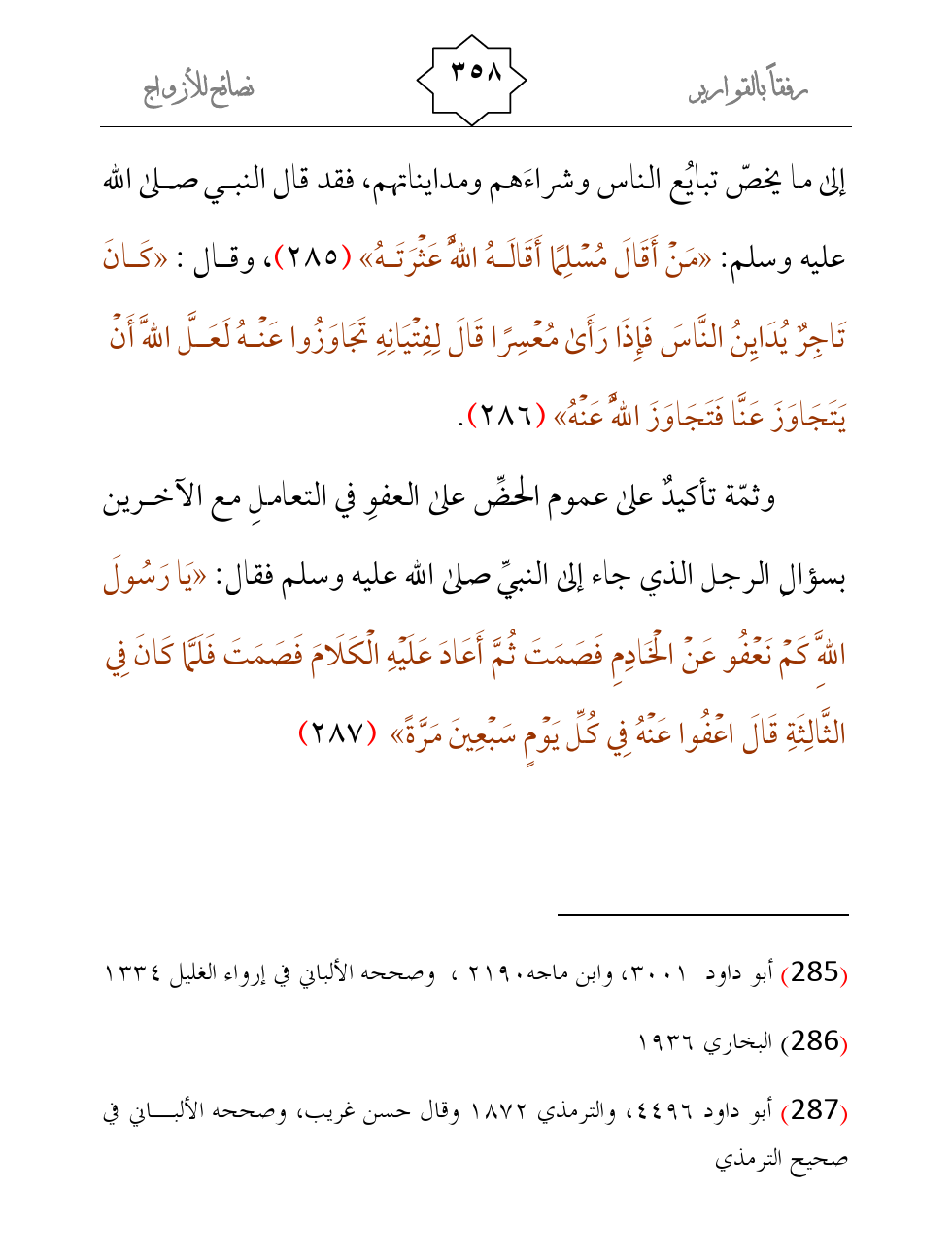 إلى ما يخصّ تبايُع الناس وشراءَهم ومدايناتهم، فقد قال النبي صلى الله عليه وسلم: «مَنْ أَقَالَ مُسْلِمًا أَقَالَهُ اللَّهُ عَثْرَتَهُ» (¬1) ، وقال: «كَانَ تَاجِرٌ يُدَايِنُ النَّاسَ فَإِذَا رَأَى مُعْسِرًا قَالَ لِفِتْيَانِهِ تَجَاوَزُوا عَنْهُ لَعَلَّ اللَّهَ أَنْ يَتَجَاوَزَ عَنَّا فَتَجَاوَزَ اللَّهُ عَنْهُ» (¬2) .