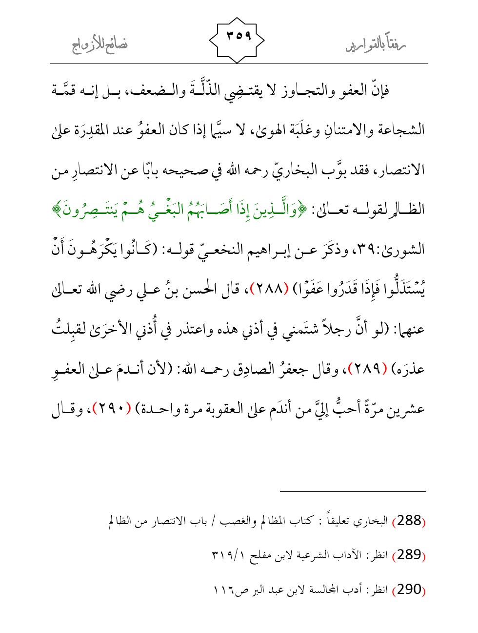 فإنّ العفو والتجاوز لا يقتضِي الذّلَّةَ والضعف، بل إنه قمَّة الشجاعة والامتنانِ وغلَبَة الهوى، لا سيَّما إذا كان العفوُ عند المقدِرَة على الانتصار، فقد بوَّب البخاريّ رحمه الله في صحيحه بابًا عن الانتصارِ من الظالم لقوله تعالى: {وَالَّذِينَ إِذَا أَصَابَهُمُ البَغْيُ هُمْ يَنتَصِرُونَ} الشورى:39، وذكَرَ عن إبراهيم النخعيّ قوله: (كَانُوا يَكْرَهُونَ أَنْ يُسْتَذَلُّوا فَإِذَا قَدَرُوا عَفَوْا) (¬1) ، قال الحسن بنُ علي رضي الله تعالى عنهما: (لو أنَّ رجلاً شتَمني في أذني هذه واعتذر في أُذني الأخرَى لقبِلتُ عذرَه) (¬2) ، وقال جعفرُ الصادِق رحمه الله: (لأن أندمَ على العفوِ عشرين مرّةً أحبُّ إليَّ من أندَم على العقوبة مرة واحدة) (¬3) ، وقال