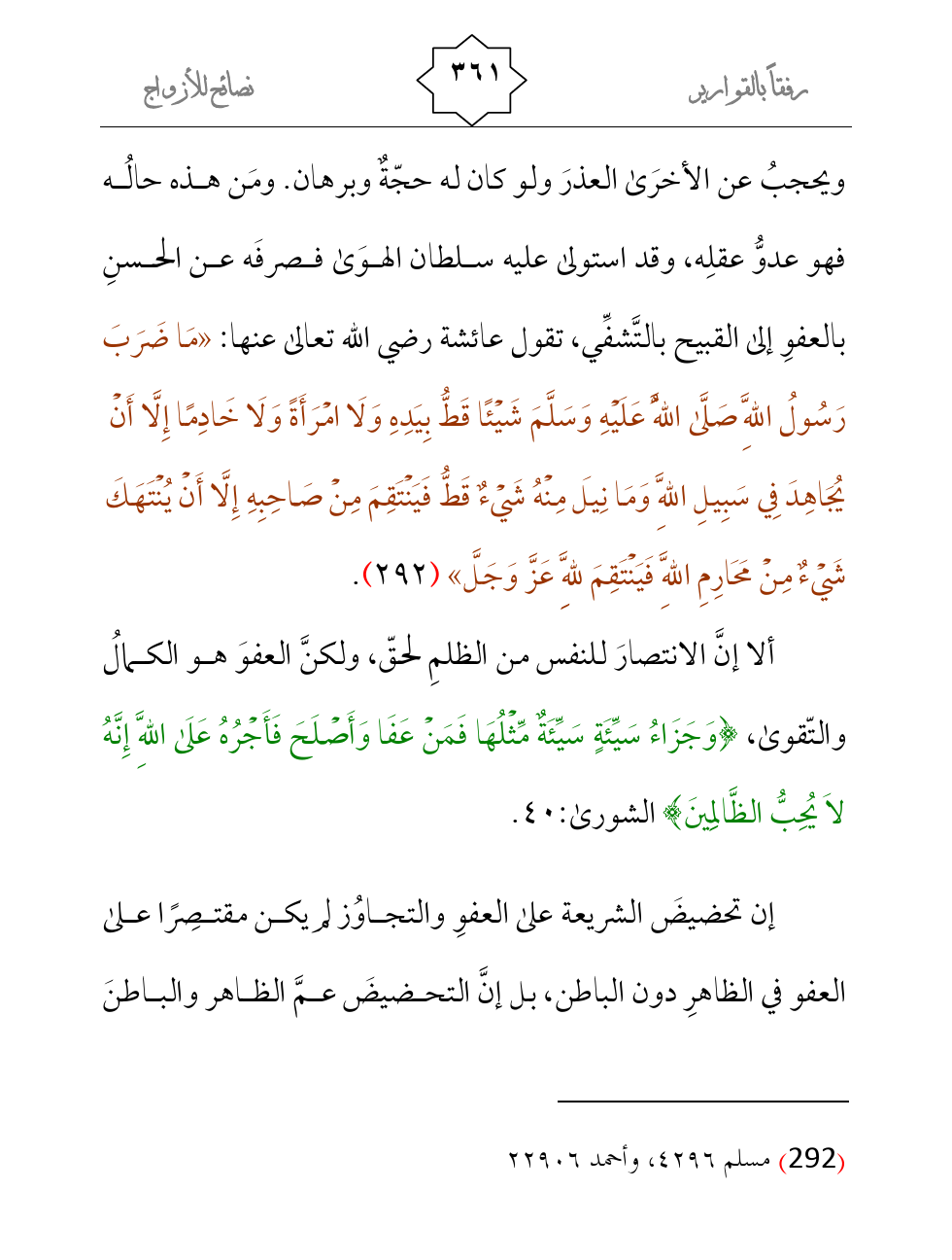 ويحجبُ عن الأخرَى العذرَ ولو كان له حجّةٌ وبرهان. ومَن هذه حالُه فهو عدوُّ عقلِه، وقد استولى عليه سلطان الهوَى فصرفَه عن الحسنِ بالعفوِ إلى القبيح بالتَّشفِّي، تقول عائشة رضي الله تعالى عنها: «مَا ضَرَبَ رَسُولُ اللَّهِ صَلَّى اللَّهُ عَلَيْهِ وَسَلَّمَ شَيْئًا قَطُّ بِيَدِهِ وَلَا امْرَأَةً وَلَا خَادِمًا إِلَّا أَنْ يُجَاهِدَ فِي سَبِيلِ اللَّهِ وَمَا نِيلَ مِنْهُ شَيْءٌ قَطُّ فَيَنْتَقِمَ مِنْ صَاحِبِهِ إِلَّا أَنْ يُنْتَهَكَ شَيْءٌ مِنْ مَحَارِمِ اللَّهِ فَيَنْتَقِمَ لِلَّهِ عَزَّ وَجَلَّ» (¬1) .