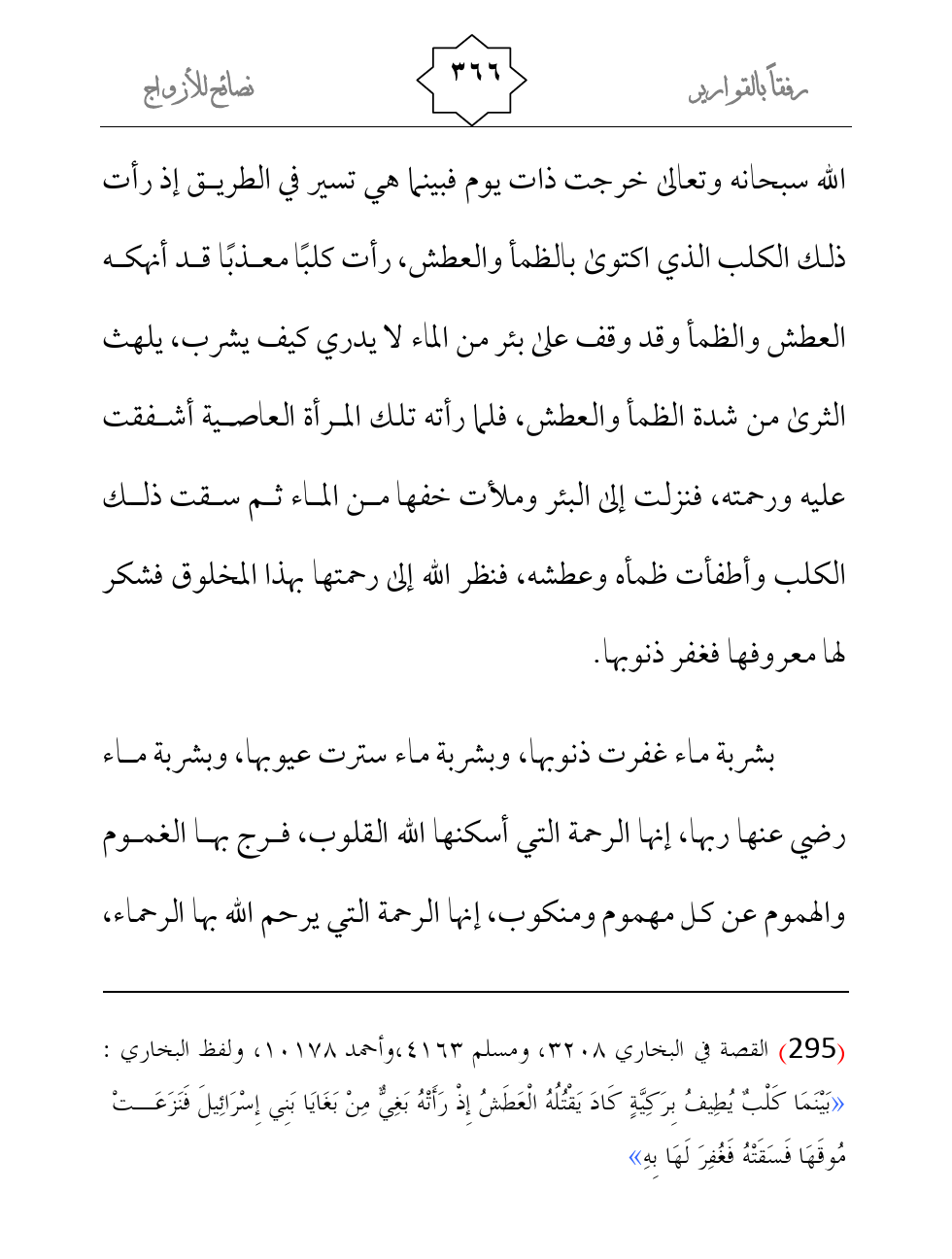 بشربة ماء غفرت ذنوبها، وبشربة ماء سترت عيوبها، وبشربة ماء رضي عنها ربها، إنها الرحمة التي أسكنها الله القلوب، فرج بها الغموم والهموم عن كل مهموم ومنكوب، إنها الرحمة التي يرحم الله بها الرحماء،
