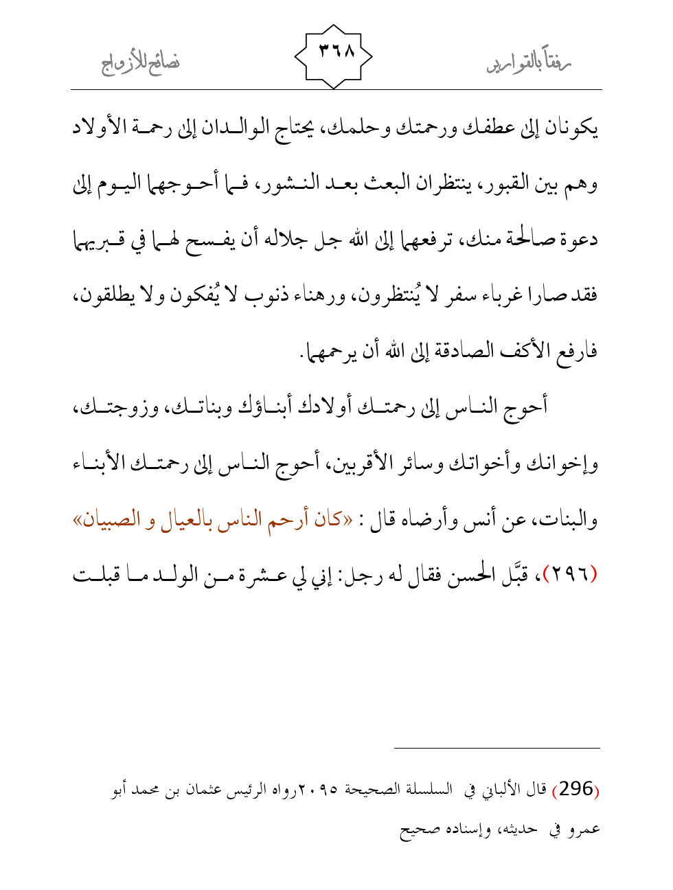 أحوج الناس إلى رحمتك أولادك أبناؤك وبناتك، وزوجتك، وإخوانك وأخواتك وسائر الأقربين، أحوج الناس إلى رحمتك الأبناء والبنات، عن أنس وأرضاه قال: «كان أرحم الناس بالعيال والصبيان» (¬1) ، قبَّل الحسن فقال له رجل: إني لي عشرة من الولد ما قبلت