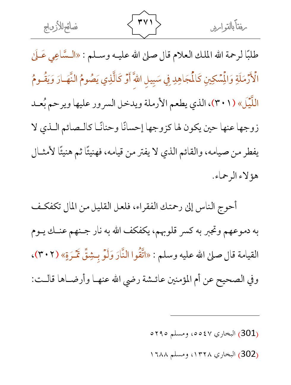 طلبًا لرحمة الله الملك العلام قال صلى الله عليه وسلم: «السَّاعِي عَلَى الْأَرْمَلَةِ وَالْمِسْكِينِ كَالْمُجَاهِدِ فِي سَبِيلِ اللَّهِ أَوْ كَالَّذِي يَصُومُ النَّهَارَ وَيَقُومُ اللَّيْلَ» (¬1) ، الذي يطعم الأرملة ويدخل السرور عليها ويرحم بُعد زوجها عنها حين يكون لها كزوجها إحسانًا وحنانًا كالصائم الذي لا يفطر من صيامه، والقائم الذي لا يفتر من قيامه، فهنيئًا ثم هنيئًا لأمثال هؤلاء الرحماء.