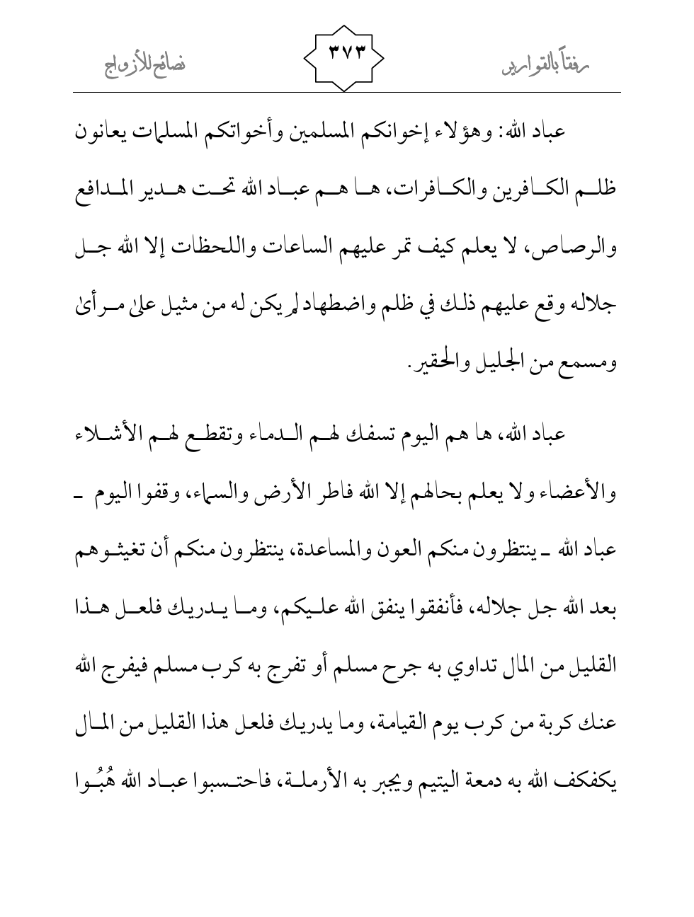 عباد الله، ها هم اليوم تسفك لهم الدماء وتقطع لهم الأشلاء والأعضاء ولا يعلم بحالهم إلا الله فاطر الأرض والسماء، وقفوا اليوم ـ عباد الله ـ ينتظرون منكم العون والمساعدة، ينتظرون منكم أن تغيثوهم بعد الله جل جلاله، فأنفقوا ينفق الله عليكم، وما يدريك فلعل هذا القليل من المال تداوي به جرح مسلم أو تفرج به كرب مسلم فيفرج الله عنك كربة من كرب يوم القيامة، وما يدريك فلعل هذا القليل من المال يكفكف الله به دمعة اليتيم ويجبر به الأرملة، فاحتسبوا عباد الله هُبُوا