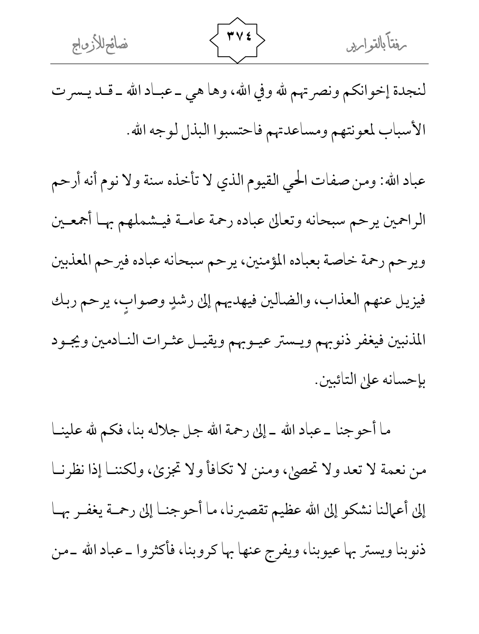 لنجدة إخوانكم ونصرتهم لله وفي الله، وها هي ـ عباد الله ـ قد يسرت الأسباب لمعونتهم ومساعدتهم فاحتسبوا البذل لوجه الله.