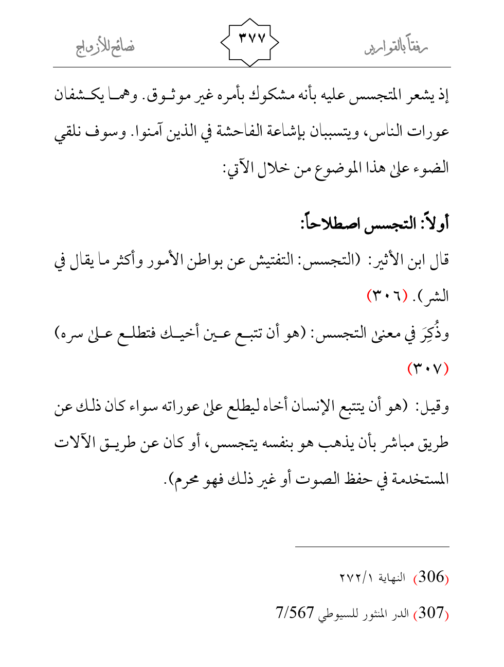 إذ يشعر المتجسس عليه بأنه مشكوك بأمره غير موثوق. وهما يكشفان عورات الناس، ويتسببان بإشاعة الفاحشة في الذين آمنوا. وسوف نلقي الضوء على هذا الموضوع من خلال الآتي:
