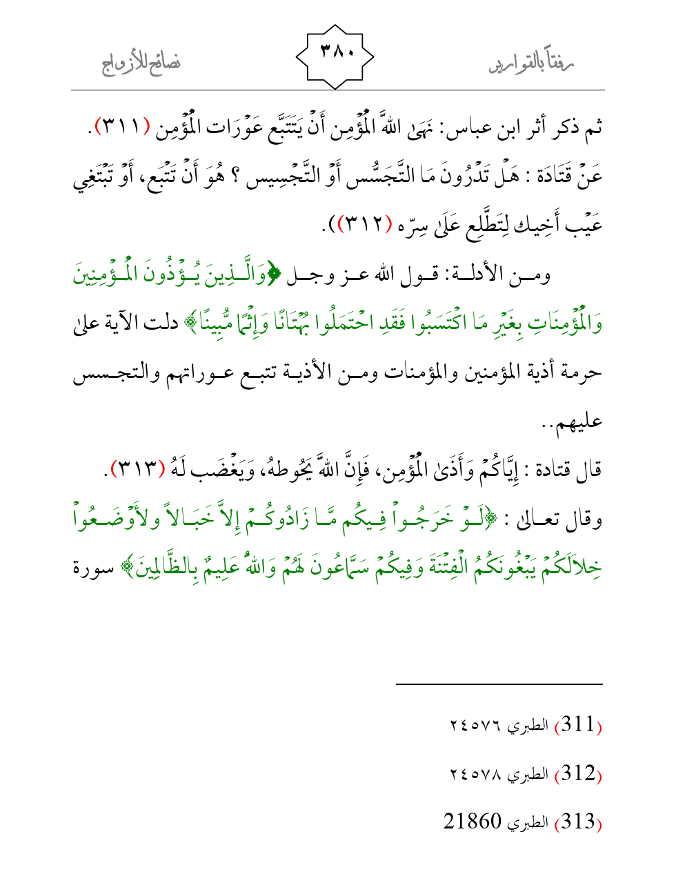 ثم ذكر أثر ابن عباس: نَهَى اللَّه الْمُؤْمِن أَنْ يَتَتَبَّع عَوْرَات الْمُؤْمِن (¬1) .