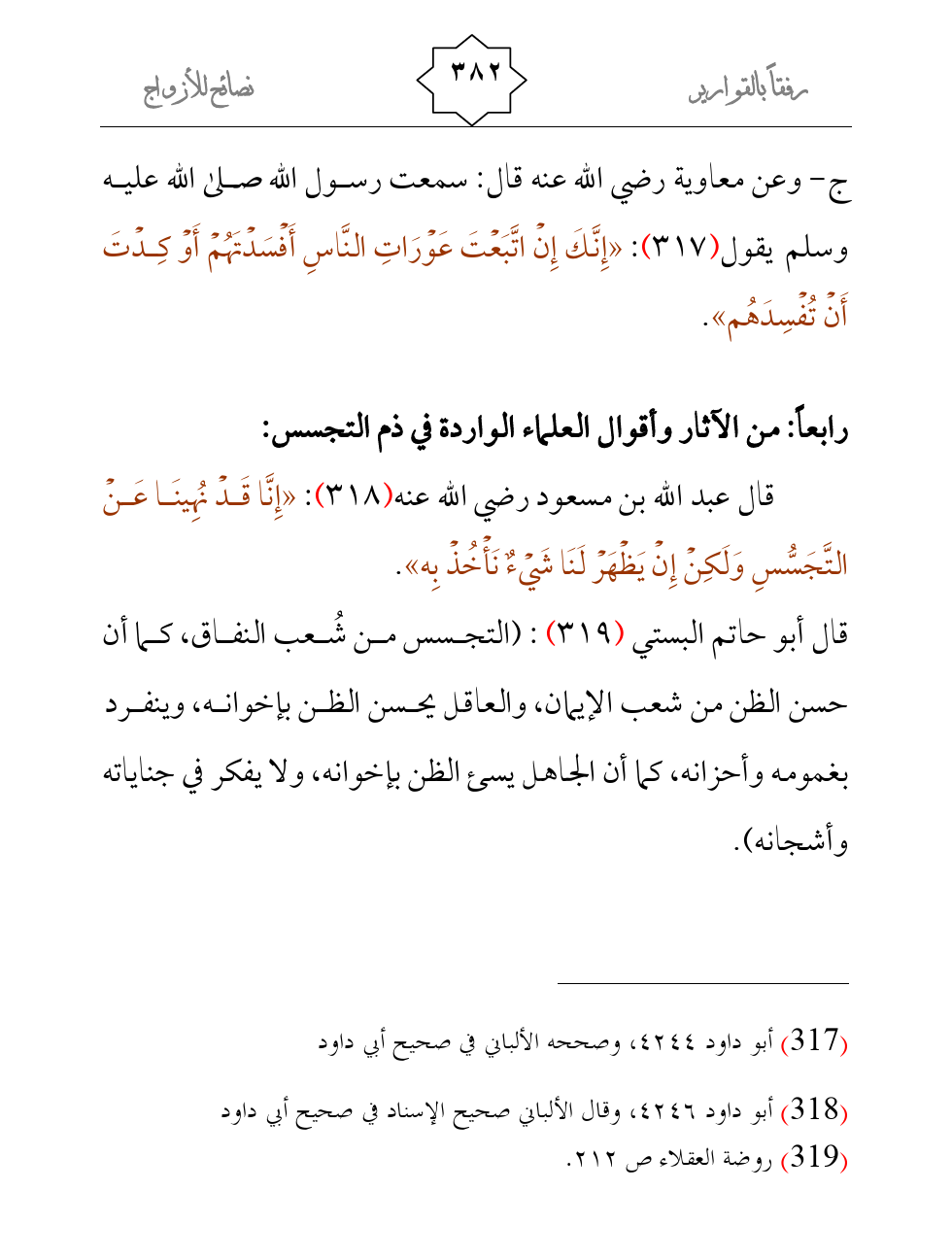 ج- وعن معاوية رضي الله عنه قال: سمعت رسول الله صلى الله عليه وسلم يقول (¬1) : «إِنَّكَ إِنْ اتَّبَعْتَ عَوْرَاتِ النَّاسِ أَفْسَدْتَهُمْ أَوْ كِدْتَ أَنْ تُفْسِدَهُم» .