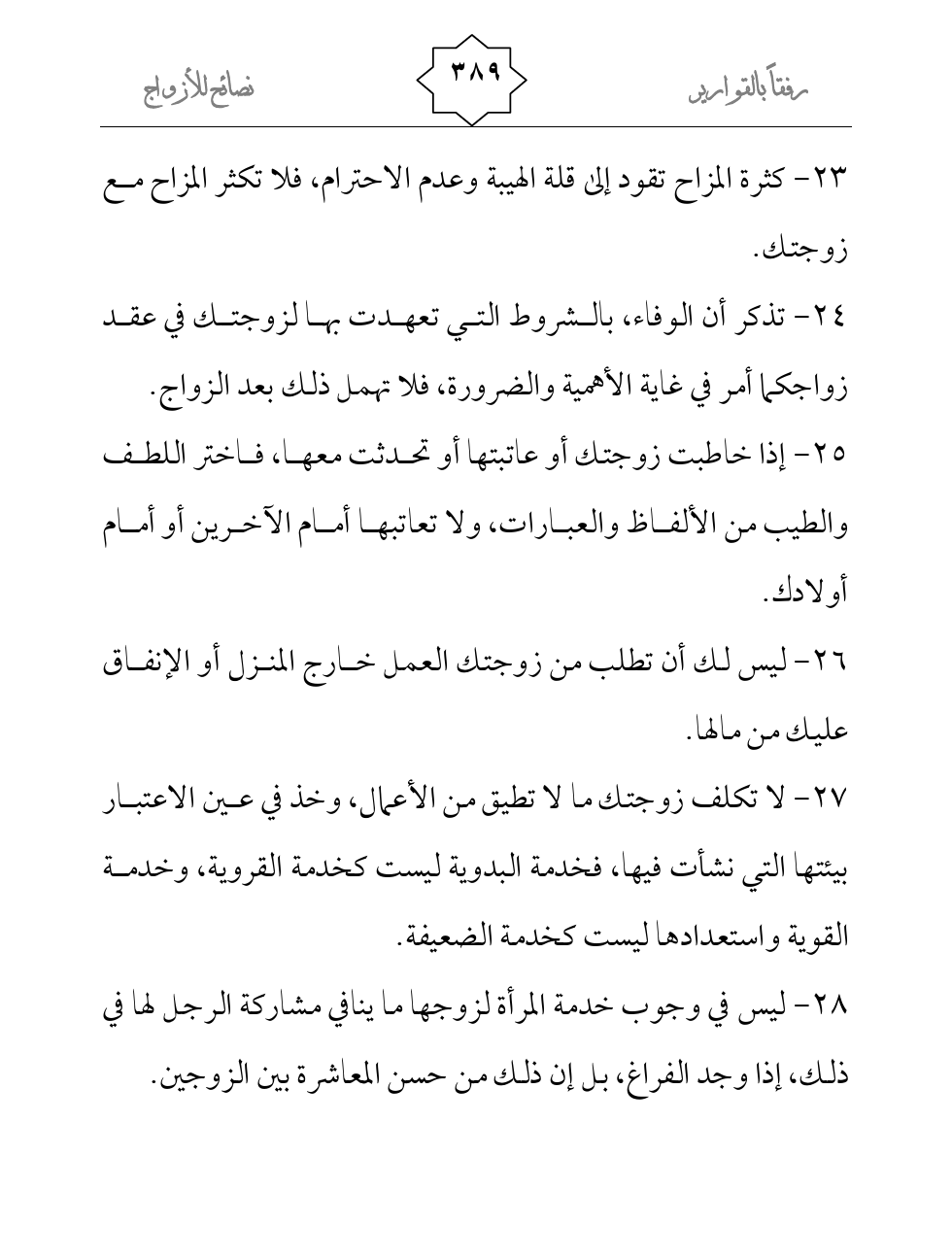 27- لا تكلف زوجتك ما لا تطيق من الأعمال، وخذ في عين الاعتبار بيئتها التي نشأت فيها، فخدمة البدوية ليست كخدمة القروية، وخدمة القوية واستعدادها ليست كخدمة الضعيفة.