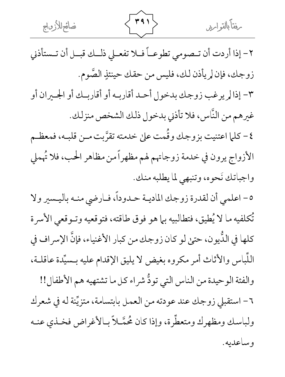 5- اعلمي أن لقدرة زوجك المادية حدوداً، فارضي منه باليسير ولا تُكلفيه ما لا يُطيق، فتطالبيه بما هو فوق طاقته، فتوقعيه وتوقعي الأسرة كلها في الدُّيون، حتى لو كان زوجك من كبار الأغنياء، فإنَّ الإسراف في اللِّباس والأثاث أمر مكروه بغيض لا يليق الإقدام عليه بسيِّدة عاقلة، والفئة الوحيدة من الناس التي تودُّ شراء كل ما تشتهيه هم الأطفال!!