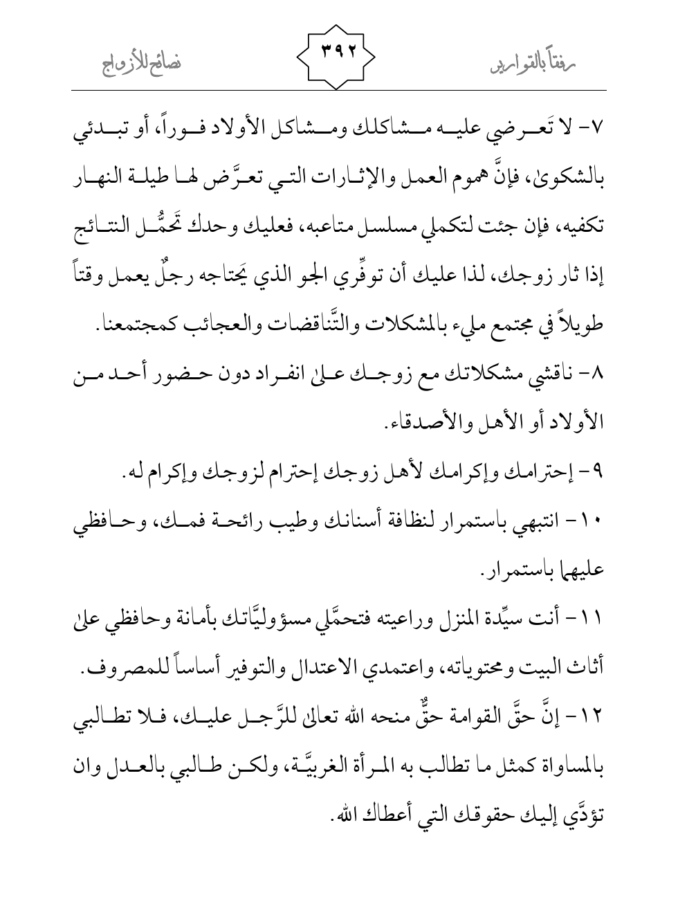12- إنَّ حقَّ القوامة حقٌّ منحه الله تعالى للرَّجل عليك، فلا تطالبي بالمساواة كمثل ما تطالب به المرأة الغربيَّة، ولكن طالبي بالعدل وان تؤدَّي إليك حقوقك التي أعطاك الله.