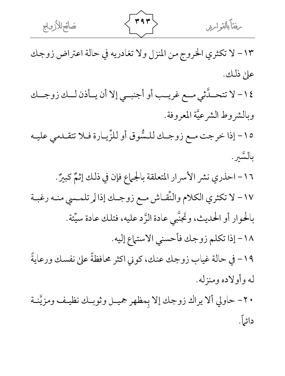 13- لا تكثري الخروج من المنزل ولا تغادريه في حالة اعتراض زوجك على ذلك.