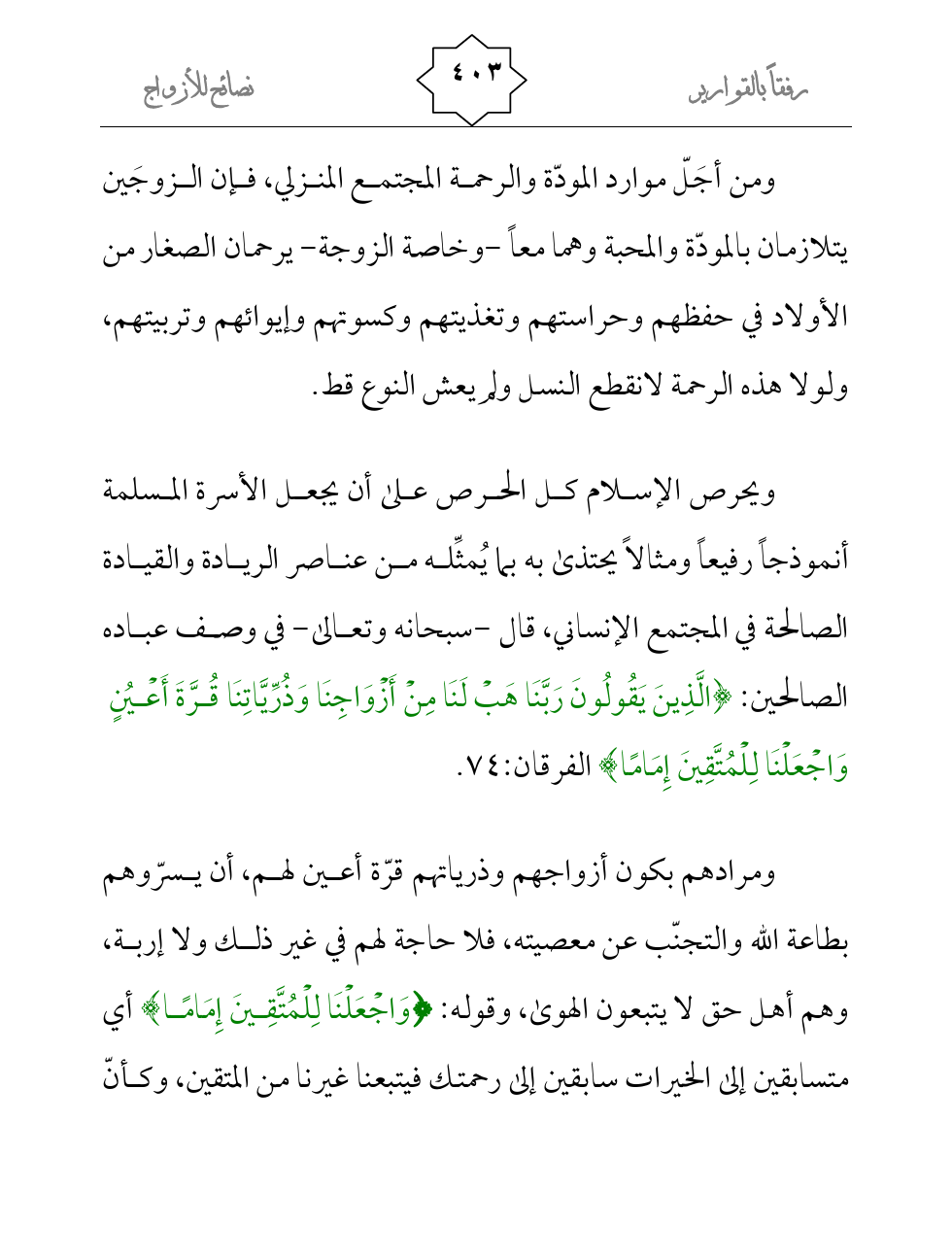 ويحرص الإسلام كل الحرص على أن يجعل الأسرة المسلمة أنموذجاً رفيعاً ومثالاً يحتذى به بما يُمثِّله من عناصر الريادة والقيادة الصالحة في المجتمع الإنساني، قال -سبحانه وتعالى- في وصف عباده الصالحين: {الَّذِينَ يَقُولُونَ رَبَّنَا هَبْ لَنَا مِنْ أَزْوَاجِنَا وَذُرِّيَّاتِنَا قُرَّةَ أَعْيُنٍ وَاجْعَلْنَا لِلْمُتَّقِينَ إِمَامًا} الفرقان:74.