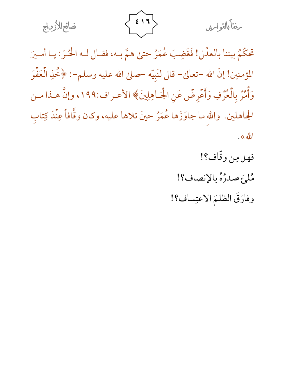 تحكُمُ بيننا بالعدْل! فَغَضِبَ عُمَرُ حتى همَّ به، فقال له الحُرّ: يا أميرَ المؤمنين! إنّ الله -تعالى- قال لنَبِيّه -صلى الله عليه وسلم-: {خُذِ الْعَفْوَ وَأْمُرْ بِالْعُرْفِ وَأَعْرِضْ عَنِ الْجَاهِلِينَ} الأعراف:199، وإنَّ هذا من الجاهلين. واللهِ ما جاوَزَها عُمَرُ حينَ تلاها عليه، وكان وقَّافاً عِنْدَ كِتابِ الله» .