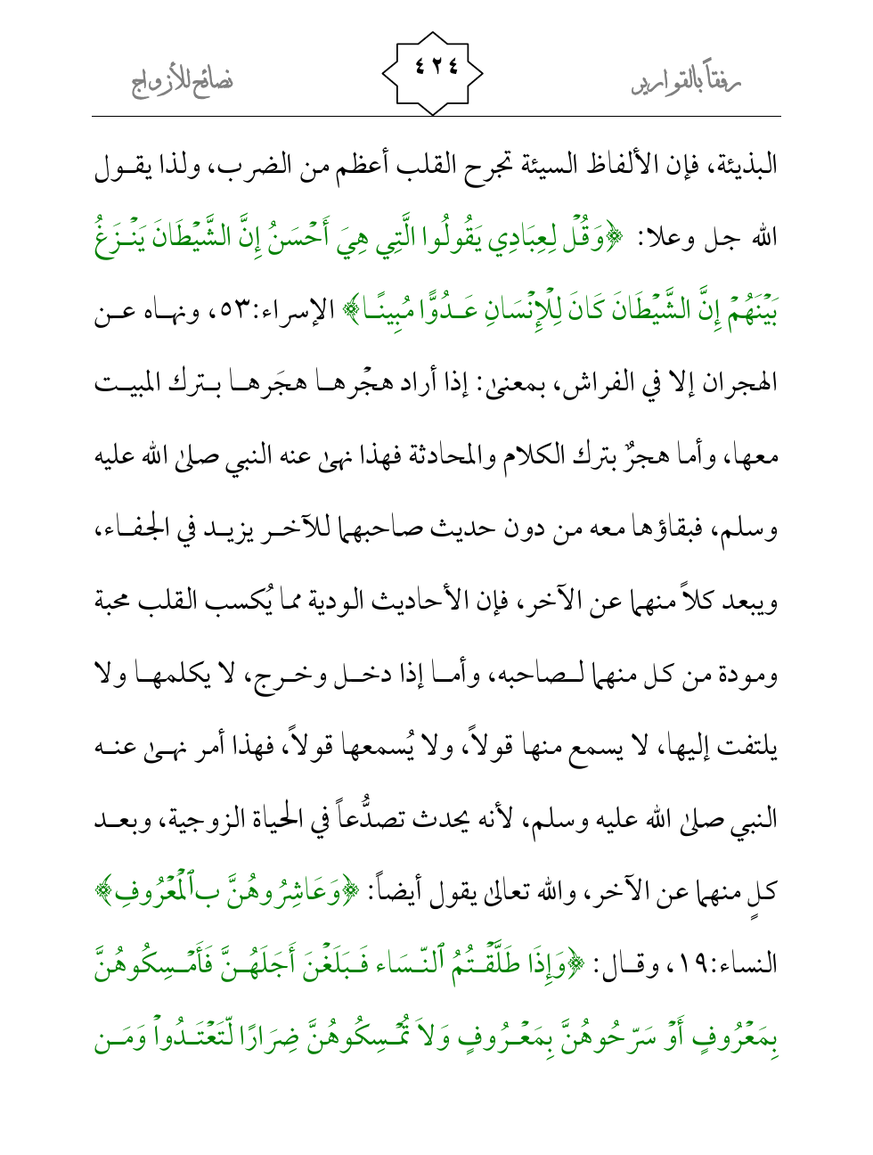 البذيئة، فإن الألفاظ السيئة تجرح القلب أعظم من الضرب، ولذا يقول الله جل وعلا: {وَقُلْ لِعِبَادِي يَقُولُوا الَّتِي هِيَ أَحْسَنُ إِنَّ الشَّيْطَانَ يَنْزَغُ بَيْنَهُمْ إِنَّ الشَّيْطَانَ كَانَ لِلْإِنْسَانِ عَدُوًّا مُبِينًا} الإسراء:53، ونهاه عن الهجران إلا في الفراش، بمعنى: إذا أراد هجْرها هجَرها بترك المبيت معها، وأما هجرٌ بترك الكلام والمحادثة فهذا نهى عنه النبي صلى الله عليه وسلم، فبقاؤها معه من دون حديث صاحبهما للآخر يزيد في الجفاء، ويبعد كلاً منهما عن الآخر، فإن الأحاديث الودية مما يُكسب القلب محبة ومودة من كل منهما لصاحبه، وأما إذا دخل وخرج، لا يكلمها ولا يلتفت إليها، لا يسمع منها قولاً، ولا يُسمعها قولاً، فهذا أمر نهى عنه النبي صلى الله عليه وسلم، لأنه يحدث تصدُّعاً في الحياة الزوجية، وبعد كلٍ منهما عن الآخر، والله تعالى يقول أيضاً: {وَعَاشِرُوهُنَّ بالْمَعْرُوفِ} النساء:19، وقال: {وَإِذَا طَلَّقْتُمُ النّسَاء فَبَلَغْنَ أَجَلَهُنَّ فَأَمْسِكُوهُنَّ بِمَعْرُوفٍ أَوْ سَرّحُوهُنَّ بِمَعْرُوفٍ وَلاَ تُمْسِكُوهُنَّ ضِرَارًا لّتَعْتَدُواْ وَمَن