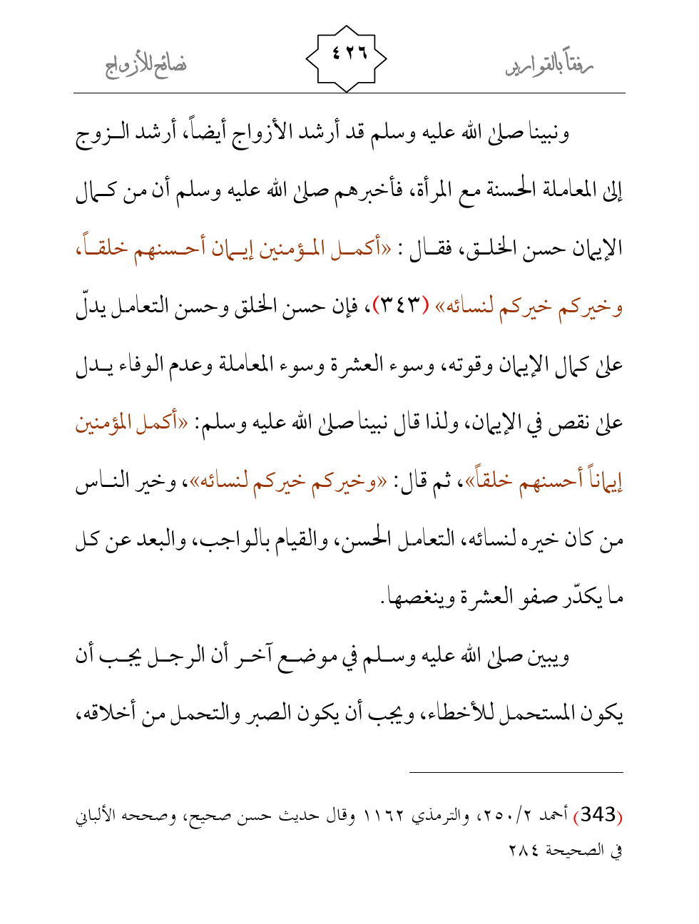 ونبينا صلى الله عليه وسلم قد أرشد الأزواج أيضاً، أرشد الزوج إلى المعاملة الحسنة مع المرأة، فأخبرهم صلى الله عليه وسلم أن من كمال الإيمان حسن الخلق، فقال: «أكمل المؤمنين إيمان أحسنهم خلقاً، وخيركم خيركم لنسائه» (¬1) ، فإن حسن الخلق وحسن التعامل يدلّ على كمال الإيمان وقوته، وسوء العشرة وسوء المعاملة وعدم الوفاء يدل على نقص في الإيمان، ولذا قال نبينا صلى الله عليه وسلم: «أكمل المؤمنين إيماناً أحسنهم خلقاً» ، ثم قال: «وخيركم خيركم لنسائه» ، وخير الناس من كان خيره لنسائه، التعامل الحسن، والقيام بالواجب، والبعد عن كل ما يكدّر صفو العشرة وينغصها.