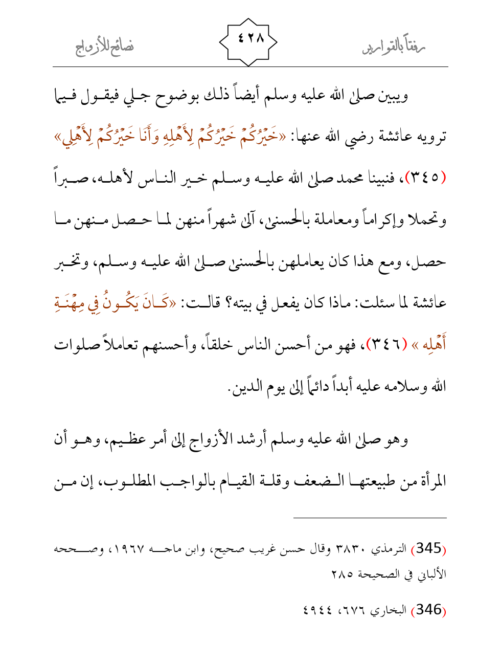 ويبين صلى الله عليه وسلم أيضاً ذلك بوضوح جلي فيقول فيما ترويه عائشة رضي الله عنها: «خَيْرُكُمْ خَيْرُكُمْ لِأَهْلِهِ وَأَنَا خَيْرُكُمْ لِأَهْلِي» (¬1) ، فنبينا محمد صلى الله عليه وسلم خير الناس لأهله، صبراً وتحملا وإكراماً ومعاملة بالحسنى، آلى شهراً منهن لما حصل منهن ما حصل، ومع هذا كان يعاملهن بالحسنى صلى الله عليه وسلم، وتخبر عائشة لما سئلت: ماذا كان يفعل في بيته؟ قالت: «كَانَ يَكُونُ فِي مِهْنَةِ أَهْلِه» (¬2) ، فهو من أحسن الناس خلقاً، وأحسنهم تعاملاً صلوات الله وسلامه عليه أبداً دائماً إلى يوم الدين.