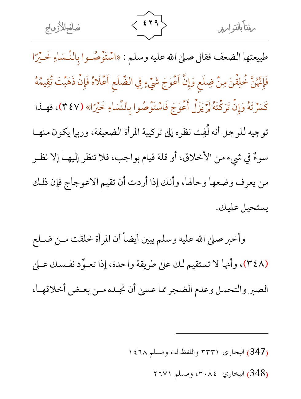 وأخبر صلى الله عليه وسلم يبين أيضاً أن المرأة خلقت من ضلع (¬2) ، وأنها لا تستقيم لك على طريقة واحدة، إذا تعوِّد نفسك على الصبر والتحمل وعدم الضجر مما عسى أن تجده من بعض أخلاقها،
