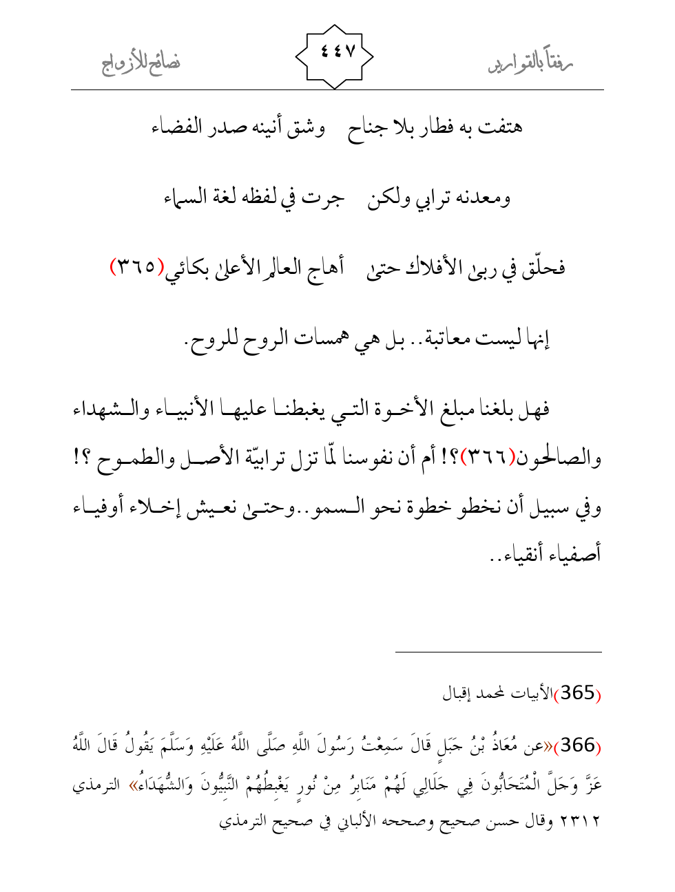 فهل بلغنا مبلغ الأخوة التي يغبطنا عليها الأنبياء والشهداء والصالحون (¬2) ؟! أم أن نفوسنا لمّا تزل ترابيّة الأصل والطموح؟! وفي سبيل أن نخطو خطوة نحو السمو..وحتى نعيش إخلاء أوفياء أصفياء أنقياء..