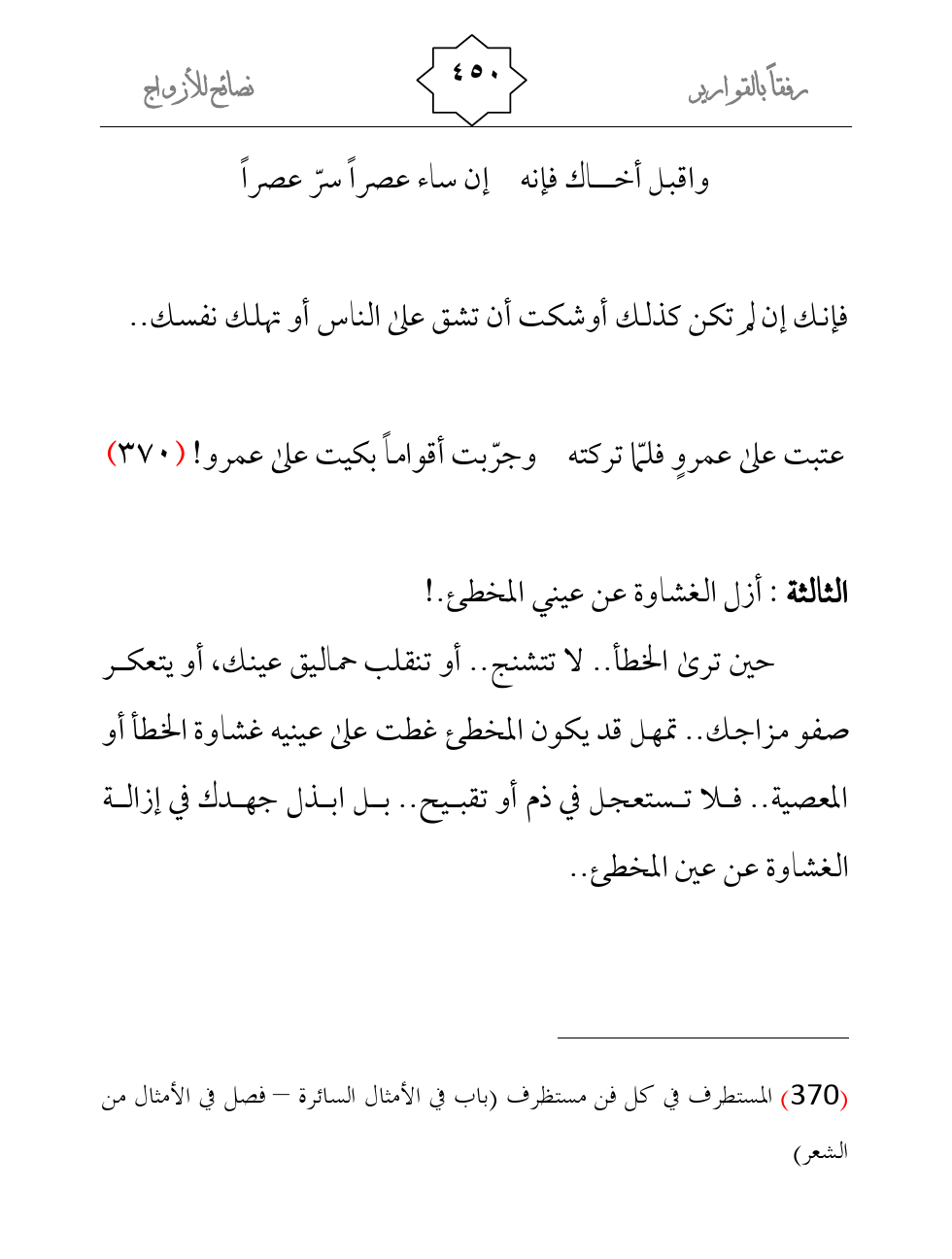 حين ترى الخطأ.. لا تتشنج.. أو تنقلب حماليق عينك، أو يتعكر صفو مزاجك.. تمهل قد يكون المخطئ غطت على عينيه غشاوة الخطأ أو المعصية.. فلا تستعجل في ذم أو تقبيح.. بل ابذل جهدك في إزالة الغشاوة عن عين المخطئ..
