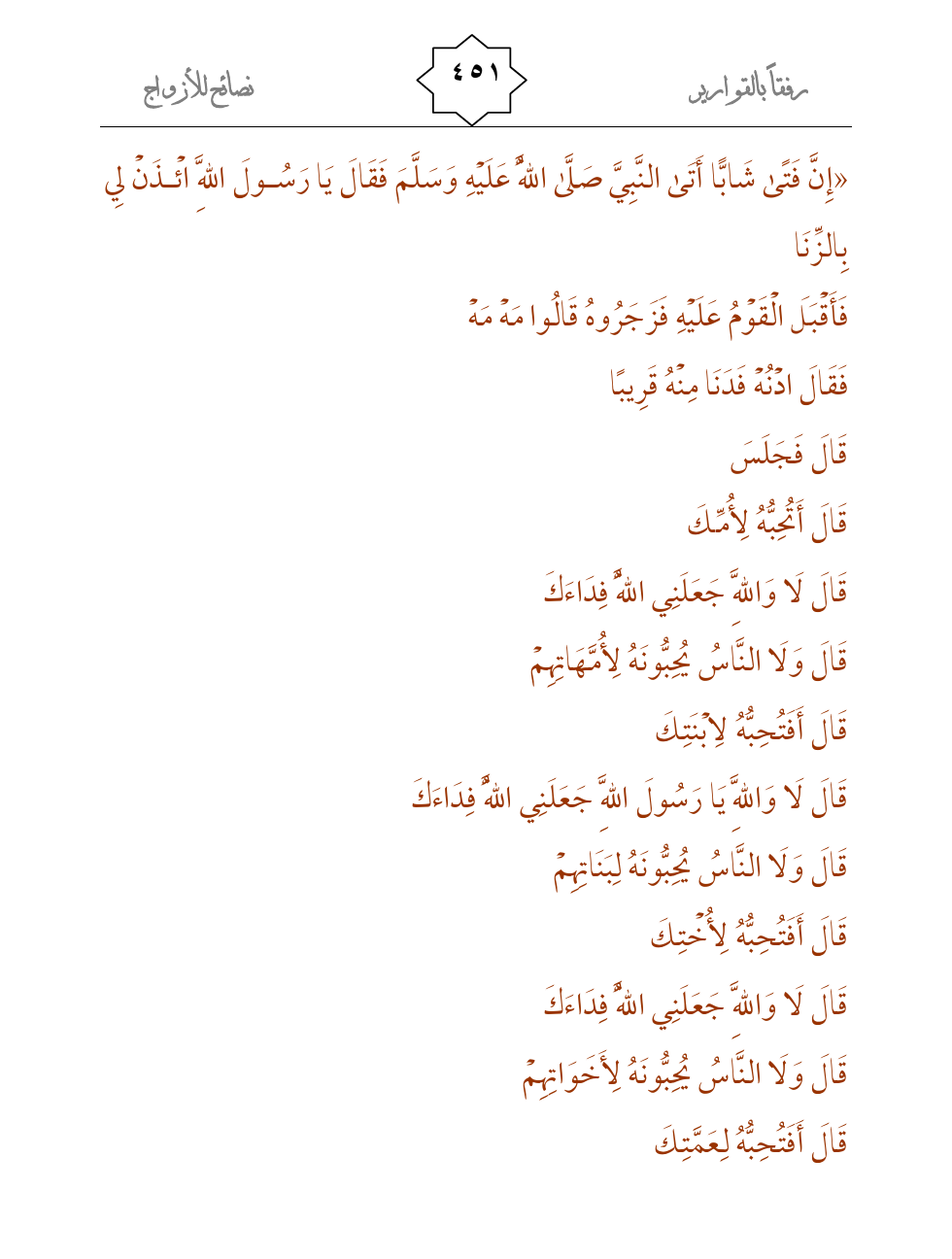 «إِنَّ فَتًى شَابًّا أَتَى النَّبِيَّ صَلَّى اللَّهُ عَلَيْهِ وَسَلَّمَ فَقَالَ يَا رَسُولَ اللَّهِ ائْذَنْ لِي بِالزِّنَا