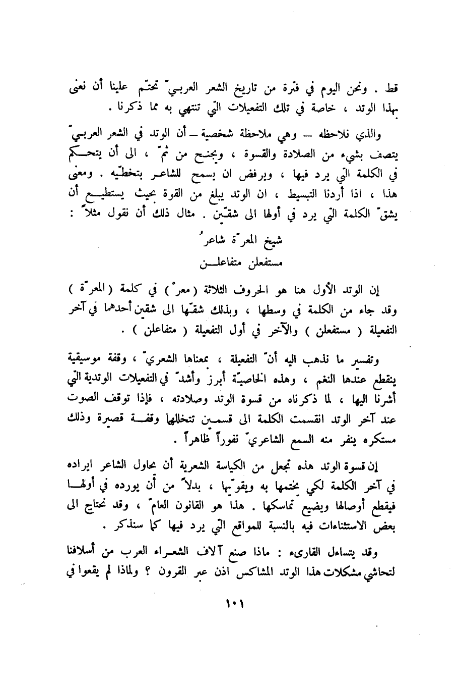 وتفسير ما نذهب إليه أن التفعيلة، بمعناها الشعري، وقفة موسيقية ينقطع عندها النغم، وهذه الخاصة أبرز وأشد في التفعيلات الوتدية التي أشرنا إليها، لما ذكرناه من قسوة الوتد وصلادته، فإذا توقف الصوت عند آخر الوتد انقسمت الكلمة إلى قسمين تتخللهما وقفة قصيرة وذلك مستكره ينفر منه السمع الشاعري نفورًا ظاهرًا.
